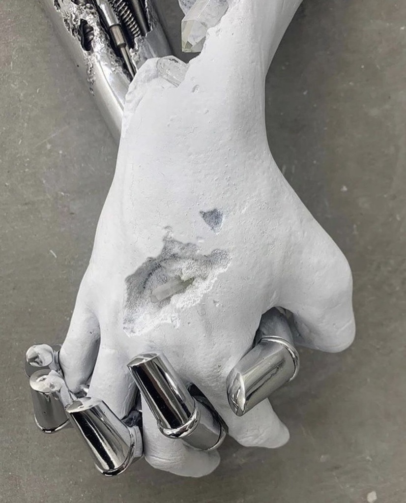 似乎是被时间侵蚀的白色大理石雕手臂,流露一种脆弱而永恒的感觉;故障的高光泽银色机械手臂,承载着科技的荣耀,却也不及想象中的可靠。“Holding Hands” 似乎是在象征着过去与未来、人类与机器之间的融合与对话;一场对时间、科技和人类关系的深刻探索。