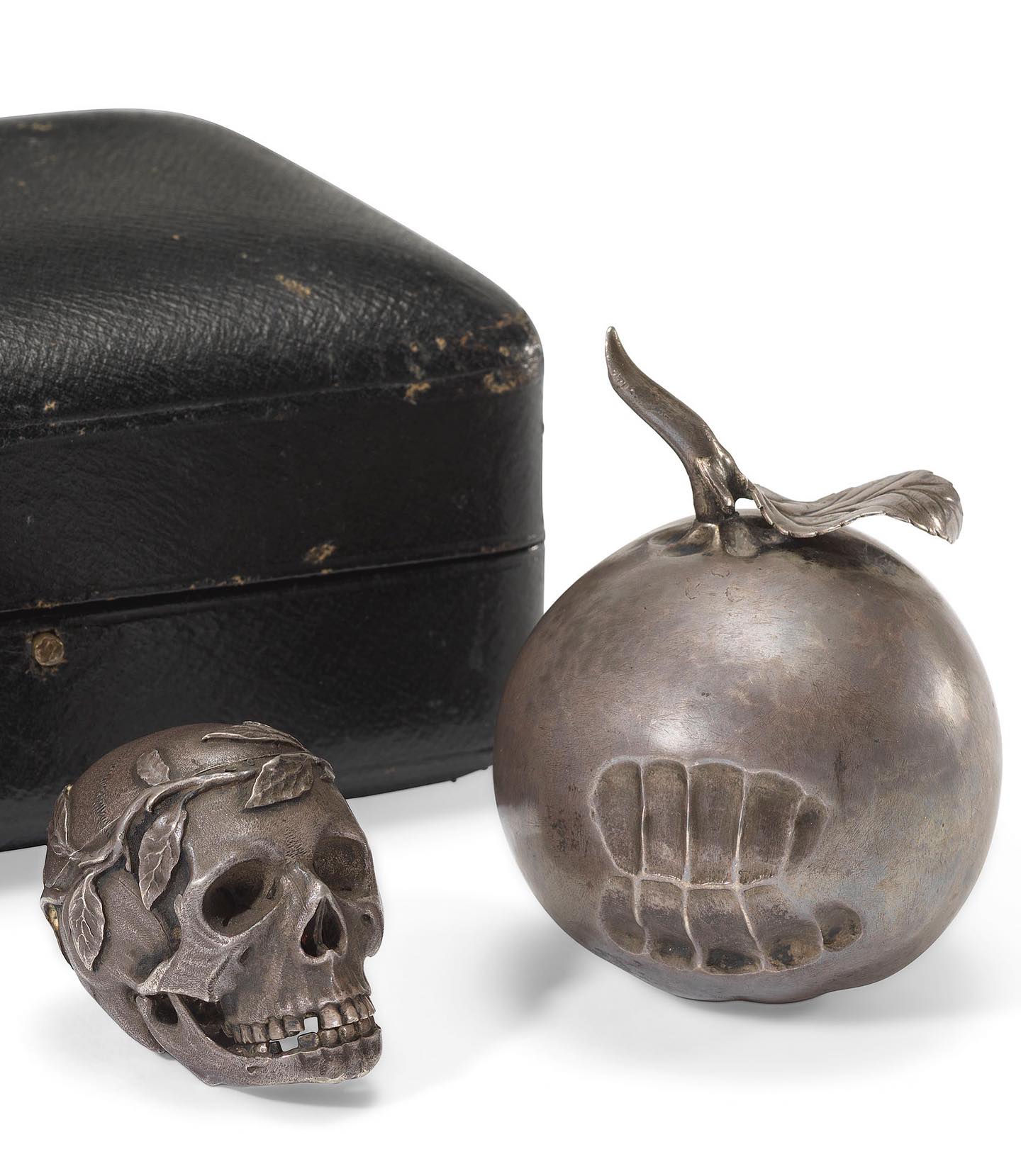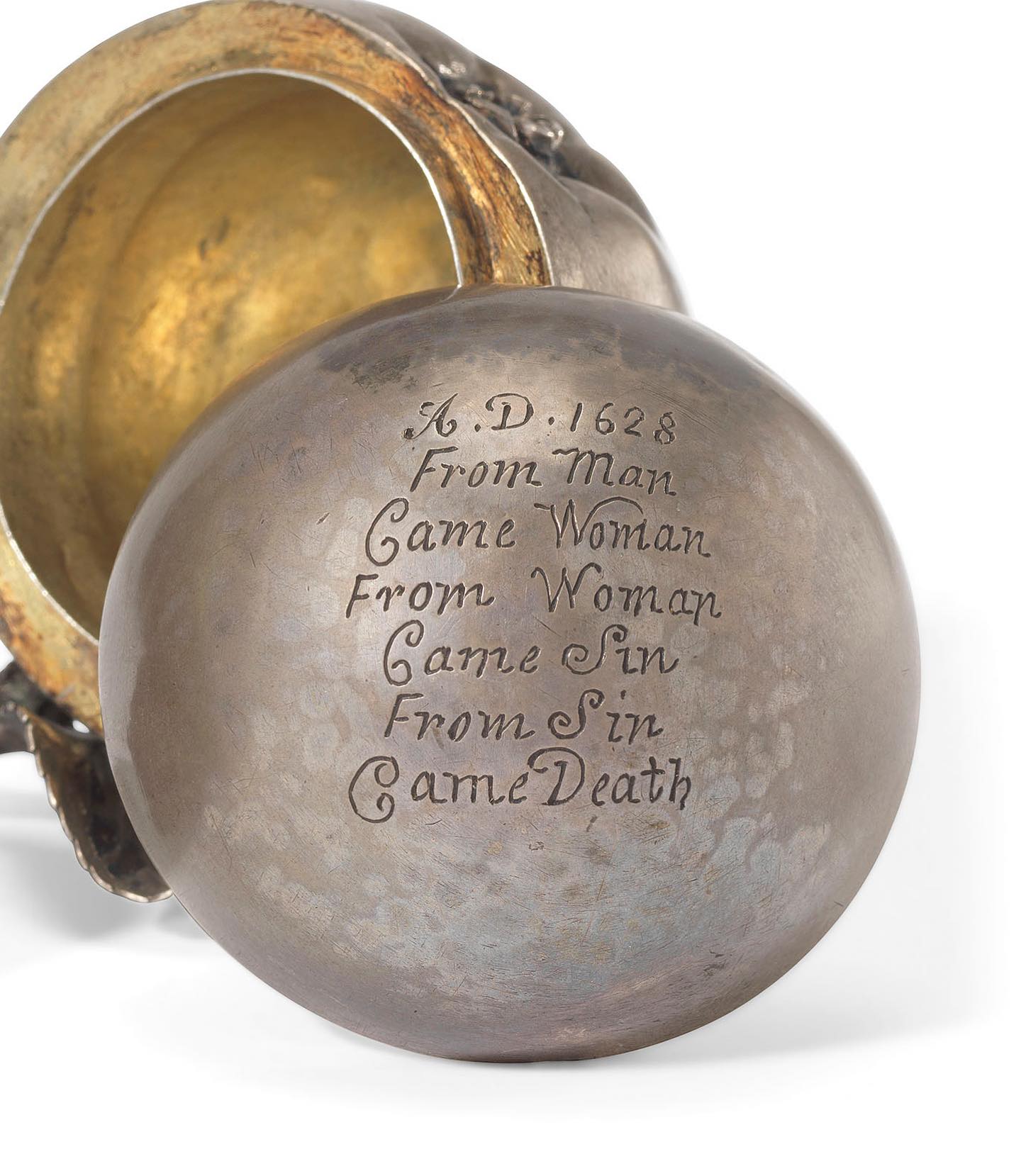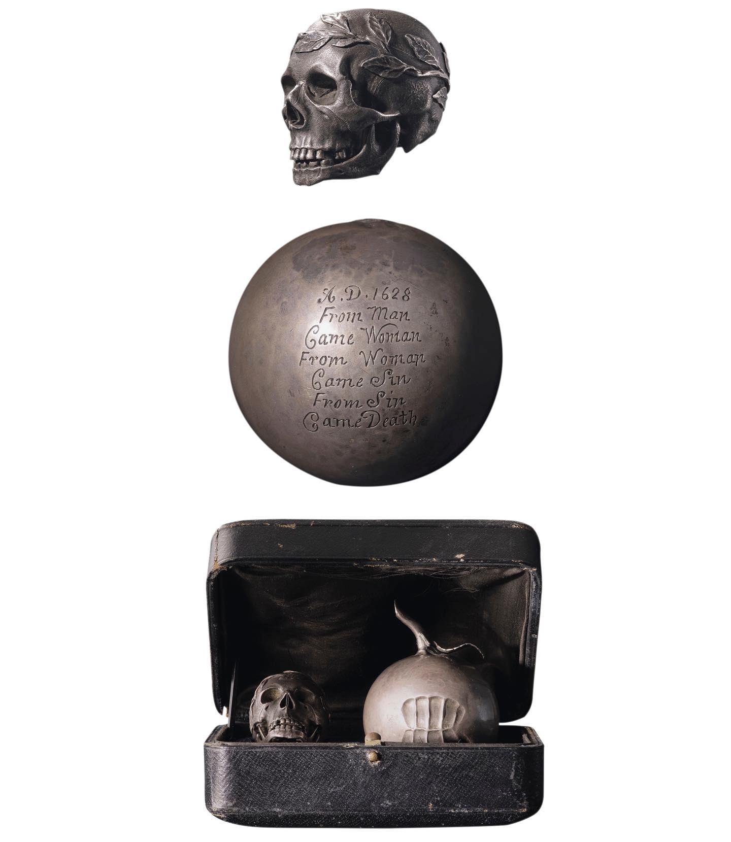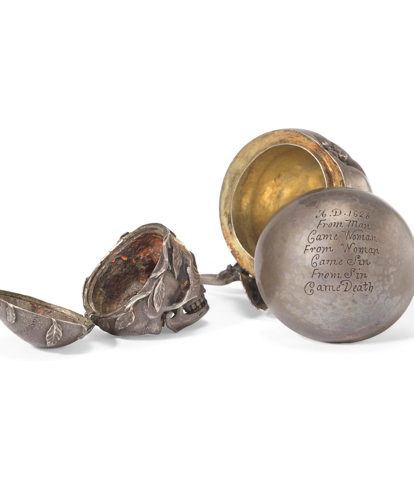 一件神秘且富有深意的17世纪英格兰银质香料盒,外观是一颗被咬过的苹果,表面刻有铭文:“公元1628年 / 男人创造了女人 / 女人带来了罪 / 罪带来了死亡。” 苹果内部藏着一颗骷髅,其顶部可打开,内有两幅小型绘画,描绘基督降入冥府,并刻有铭文:“死后,生命永恒。”