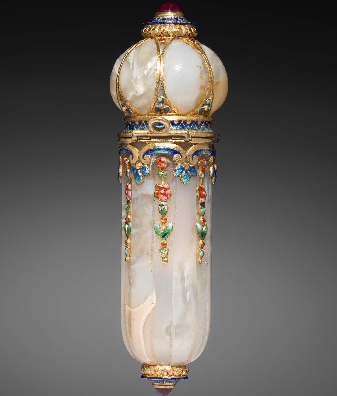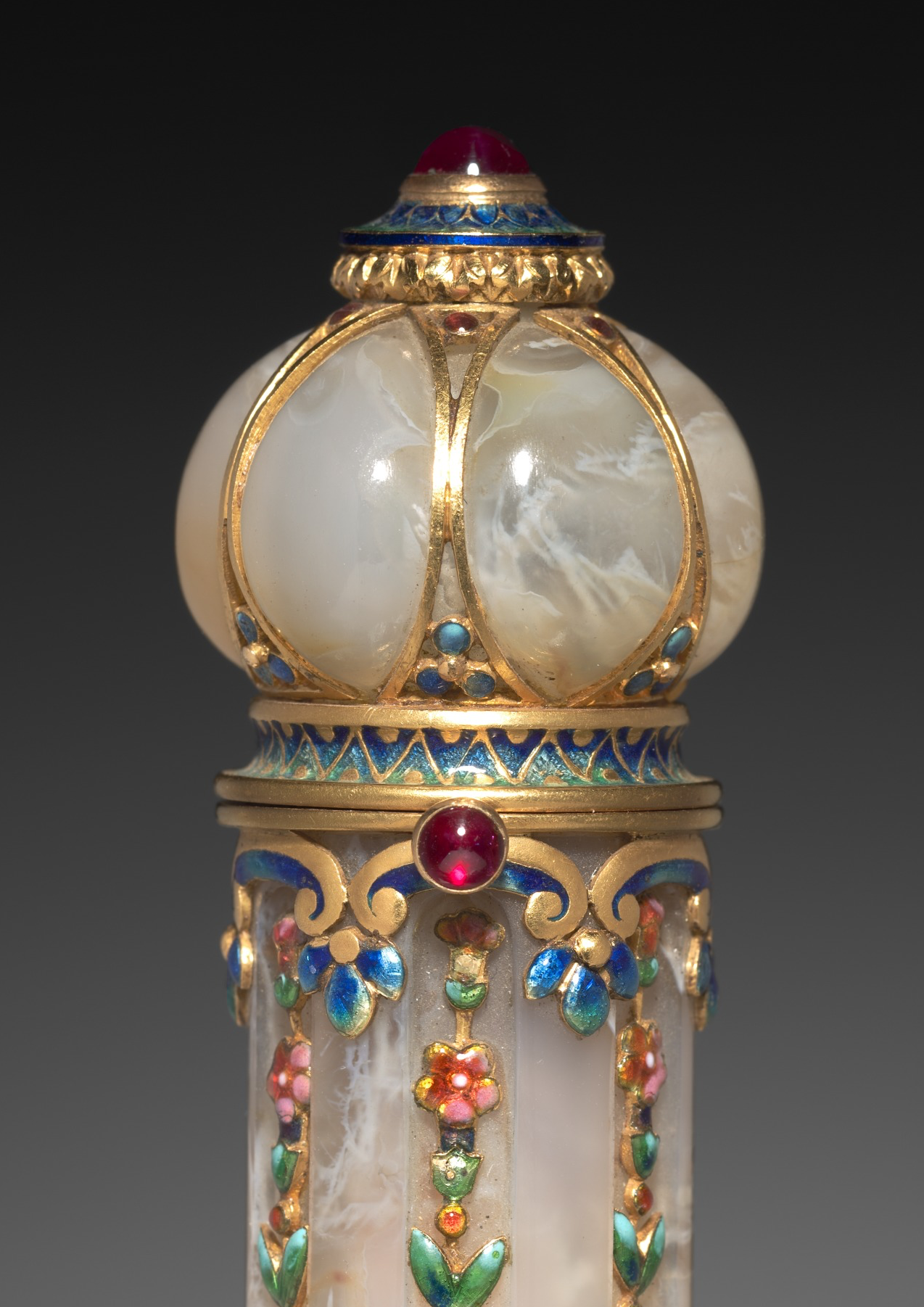 Tecla香水瓶,玛瑙搭配珐琅/黄金/红宝石,约1900年,瓶盖边缘刻有“Tiffany & Co.”字样,8.3 × 2.5cm(3 1/4 × 1 英寸),藏于Cleveland Museum of Art