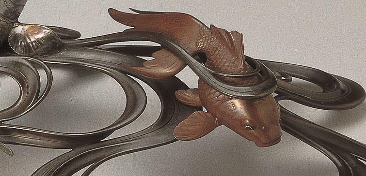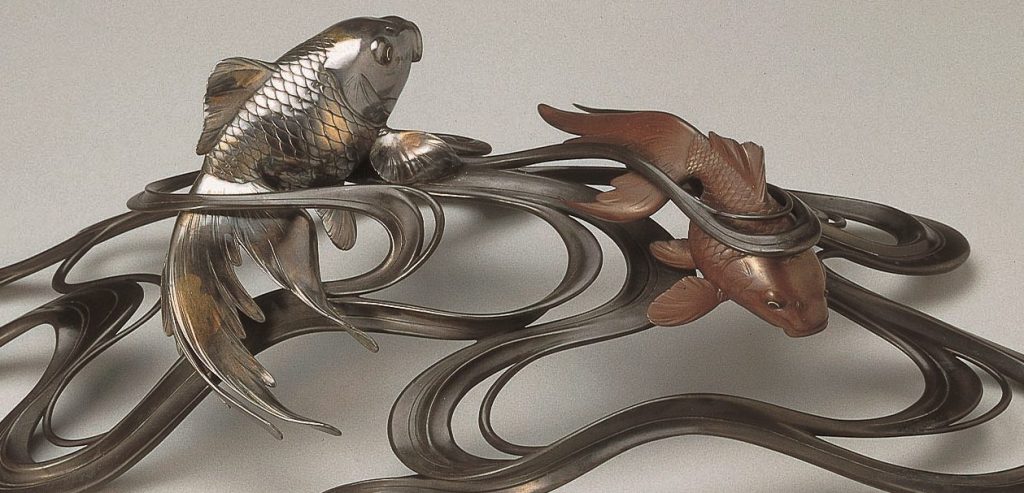 这件名为《波中游鱼(Fish in Waves)》的金工雕塑,由日本明治时期著名工艺师大岛如雲(Oshima Joun, 1858-1940)打造,以青铜、银、赤铜等金属精巧锻造而成。作品展现了两条锦鲤在波涛间游弋的生动画面,一只以氧化银铸造,并局部鎏金,另一只则采用深色铜材,鱼眼更是用不同金属镶嵌,使其富有灵动神采。