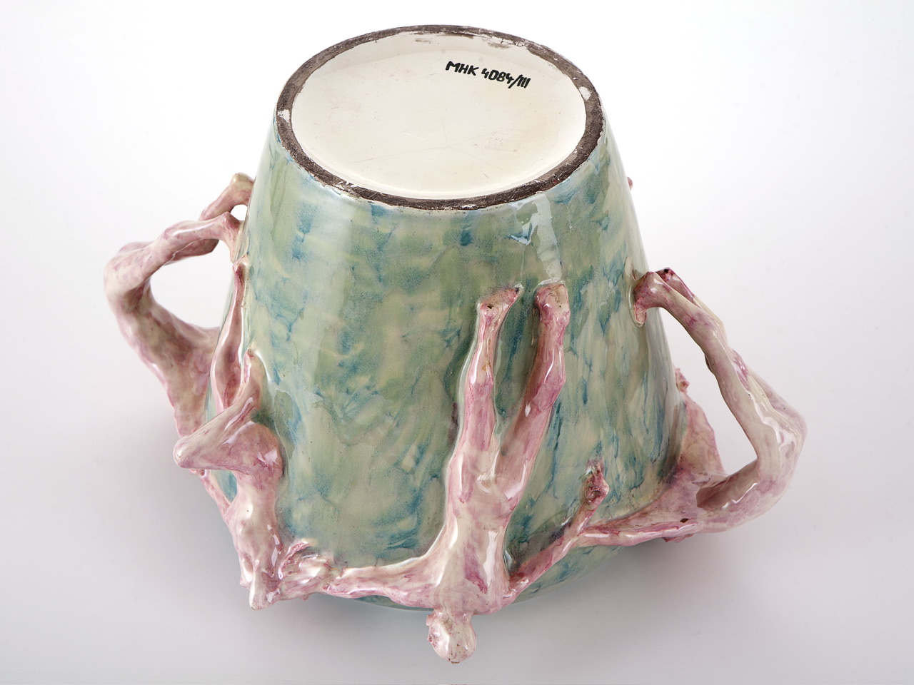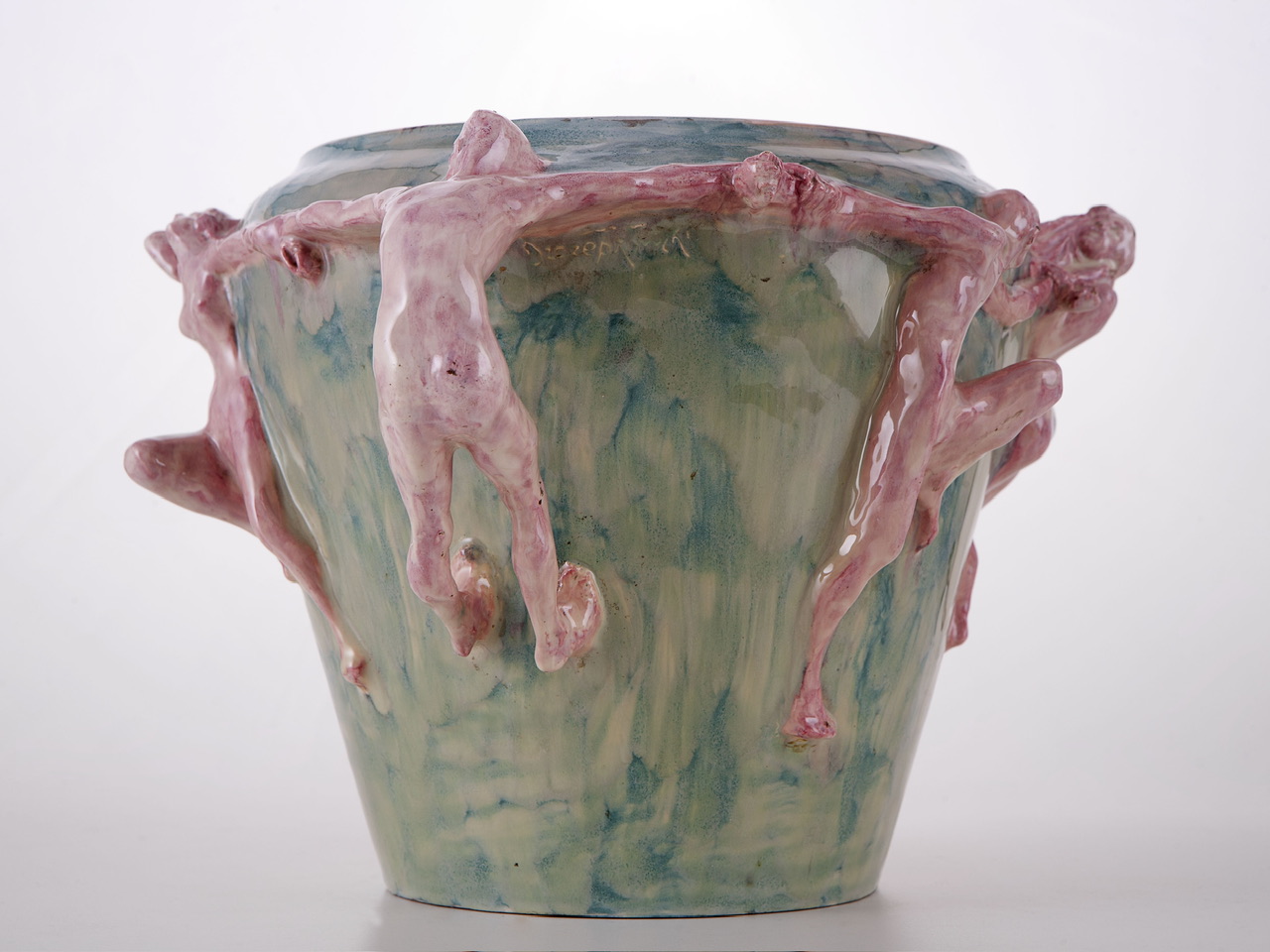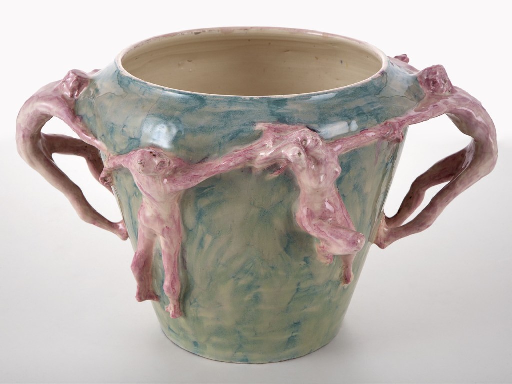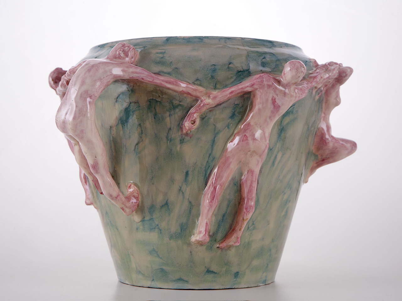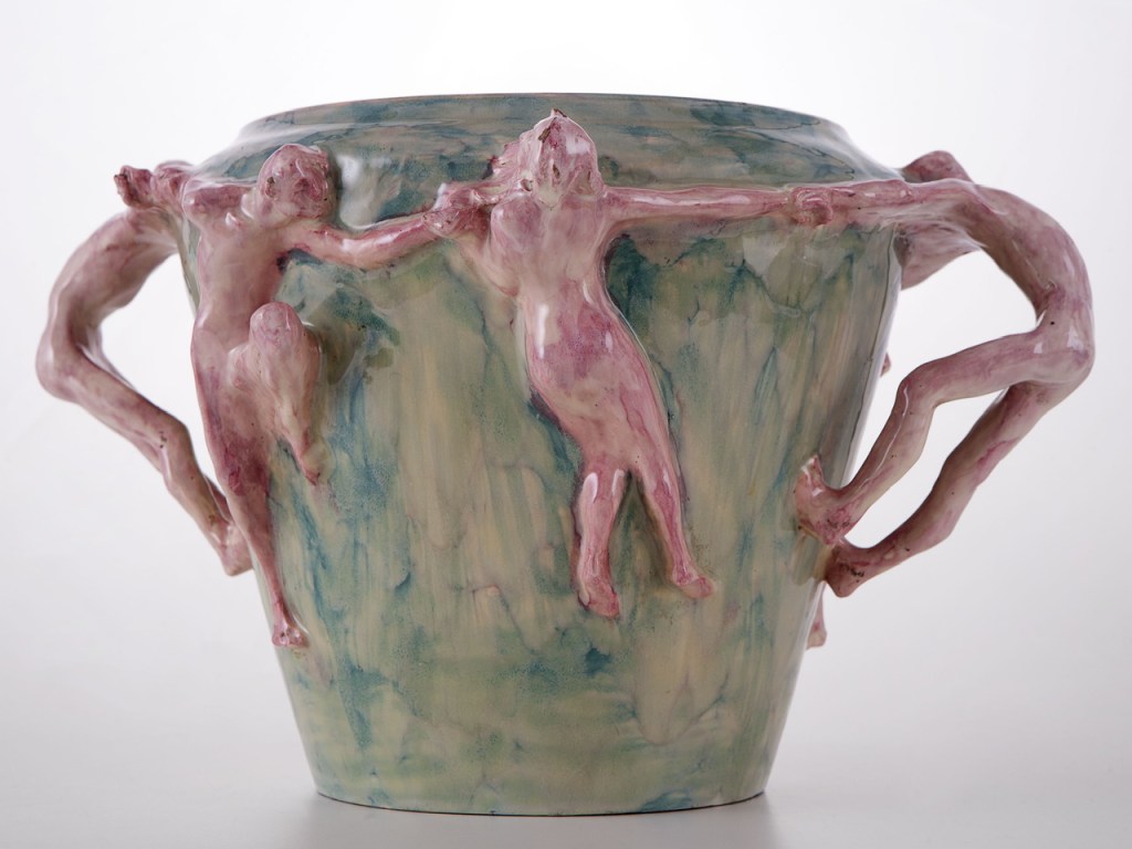 一款底部平坦、向上逐渐扩展的陶瓷花瓶。围绕瓶身,装饰着一圈手牵手共舞的人形雕塑,这些人物不仅构成装饰,还同时充当花瓶的把手。作品融合了陶轮拉坯与雕塑工艺,体现了新艺术运动(Art Nouveau)对自然形态与手工艺的推崇。