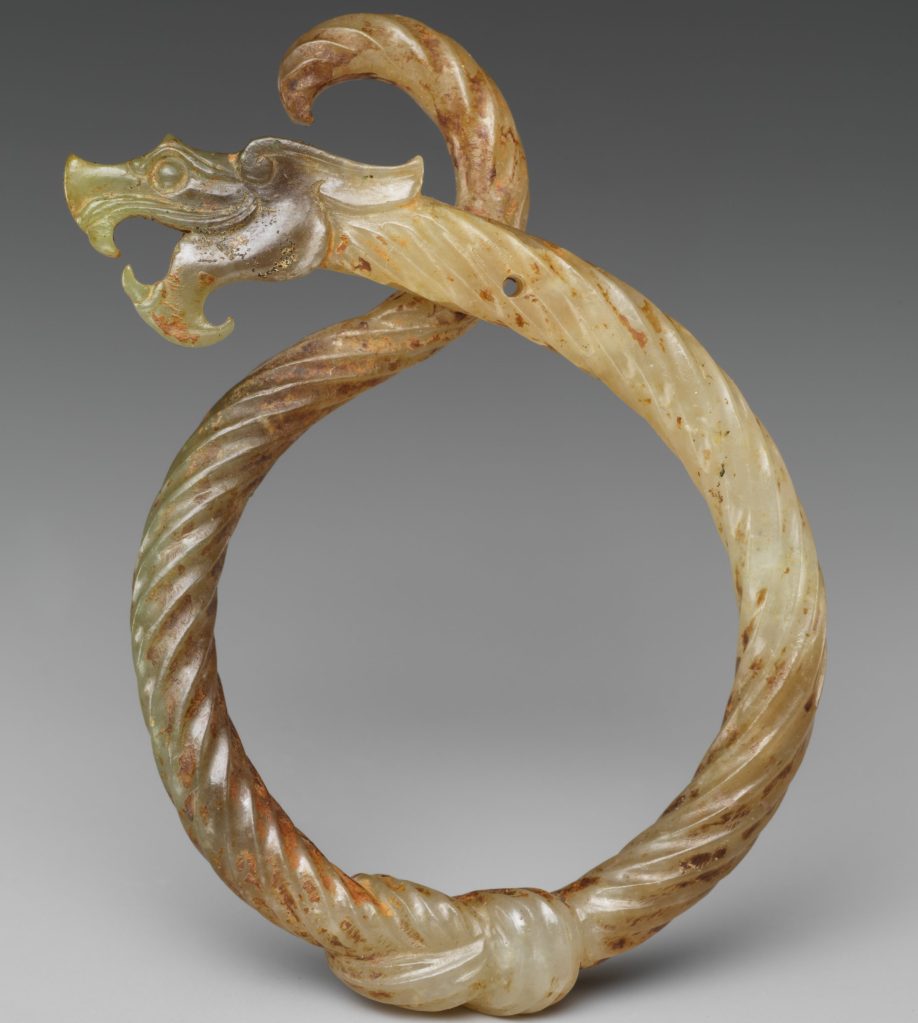 这件战国玉龙,不再腾云驾雾、英姿飒爽,而是将身躯扭成结、弯成环,仿佛打了一个”心结”。它运用了罕见的“扭绞”工艺——一种原本常见于编织和金属的技法,赋予了坚硬玉石以柔韧和流动的张力。正如战国时期礼崩乐坏、思想奔涌,儒道并起,“道法自然”渐成风气,艺术也从权威与秩序的表达,转向对生命节奏的回应。这条龙,也不再威严肃穆,而像是陷入了“纠结”,却又在自身轨迹中盘旋起舞。