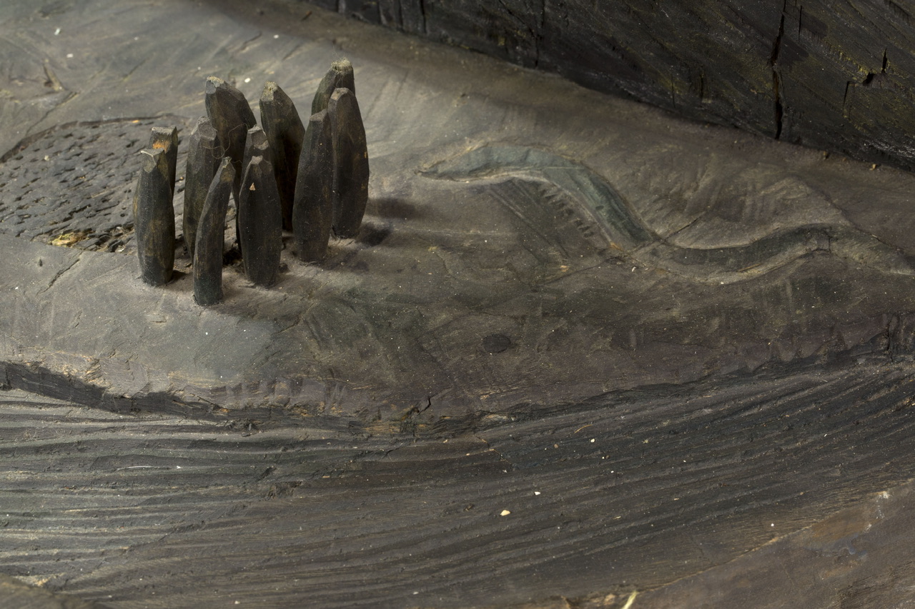 一位戴着王冠的母亲,静坐于土地之上,双手抱着儿子的遗体——若不是他脸上的胡茬,人们或许会以为她怀中的是一个婴儿。木基座上刻着极其细微的痕迹:鸟爪、兽踪、蛋巢、树纹与河流。你需走近,蹲下,静默,才能察觉它们的存在。