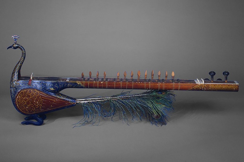 这种在19世纪印度宫廷风靡的弓弦乐器融合了多种本土弦乐器的特点:琴身取自萨朗吉(sarangi),品丝与琴颈则借鉴了西塔琴(sitar)。它配有四根旋律弦和十五根共鸣弦,在为宗教民歌伴奏时,所有琴弦会共同震颤共鸣。孔雀作为音乐女神萨拉斯瓦蒂(Sarasvatî)的坐骑,在印度诗歌中常被用作求爱的隐喻意象。