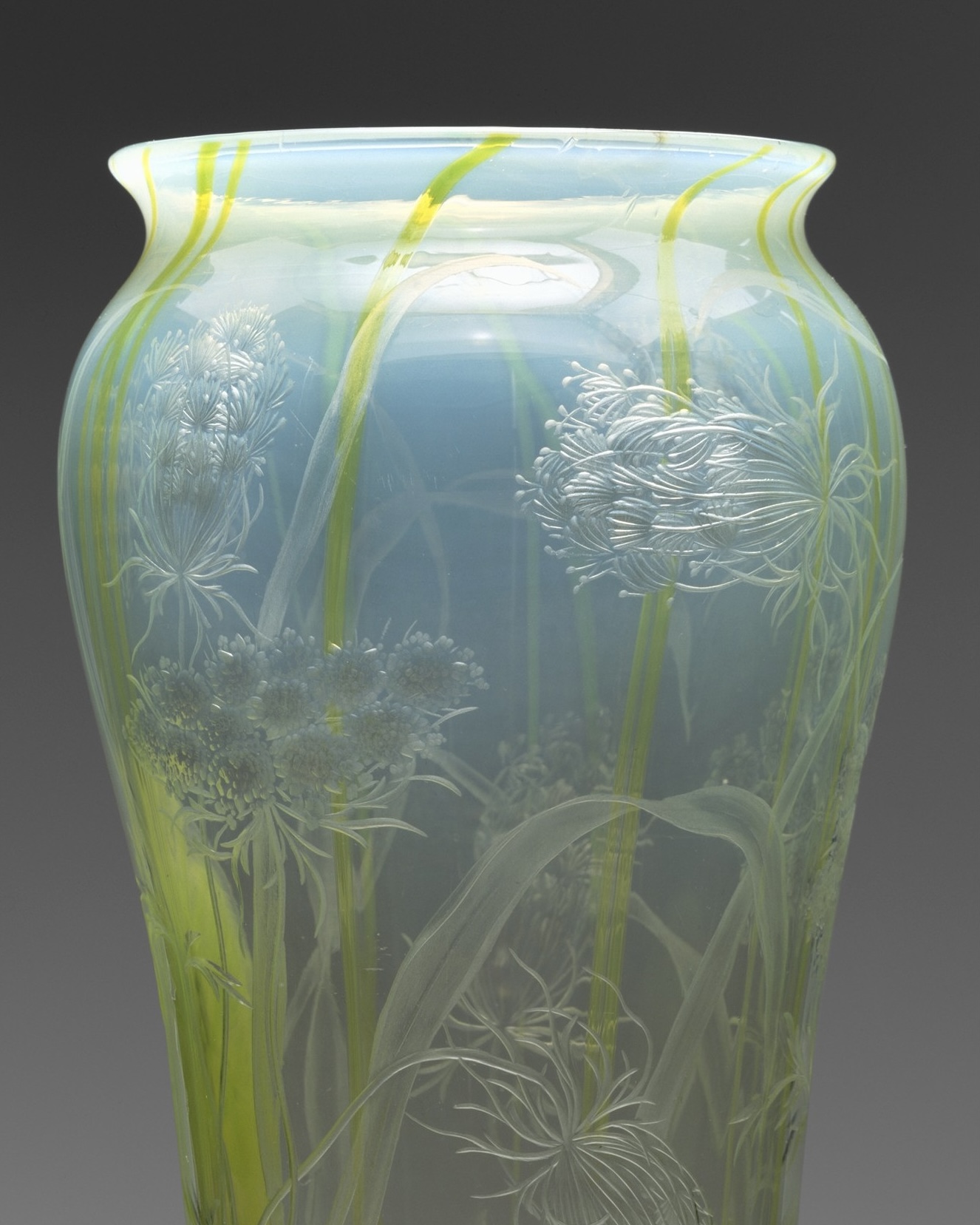 这只花瓶采用套料切割工艺装饰于近乎无色的玻璃胎体上。蓝白色晕彩口沿是通过将器皿二次回炉烧制形成的特殊效果。蒂芙尼公司此类装饰技艺的代表人物是弗雷多林·克赖施曼(Fredolin Kreischmann)——一位技艺超群的玻璃切割与雕刻大师,他在蒂芙尼早期吹制玻璃花瓶生产阶段便已加入团队。克赖施曼的独门技艺曾任职于英国斯托尔布里奇的托马斯·韦伯公司(Thomas Webb),这家企业正是此类工艺的领军者。在为蒂芙尼效力的五年间(直至1898年逝世),他创作出了该公司有史以来最令人叹为观止的作品。此花瓶展现出与常见刻花玻璃截然不同的灵动气韵。蒂芙尼最钟爱的两种自然母题——睡莲叶与安妮女王蕾丝花(野胡萝卜花)——在瓶身若隐若现:浅春绿色的玻璃被运用在花瓶下部,雕琢成莲叶形态,同色系的茎蔓仿佛向上漂浮至器口;而那些精妙的花朵更彰显出雕刻师非凡的功力——每朵小花蕊都被精准刻画,花朵以多角度呈现,甚至细致区分了不同绽放阶段的状态。