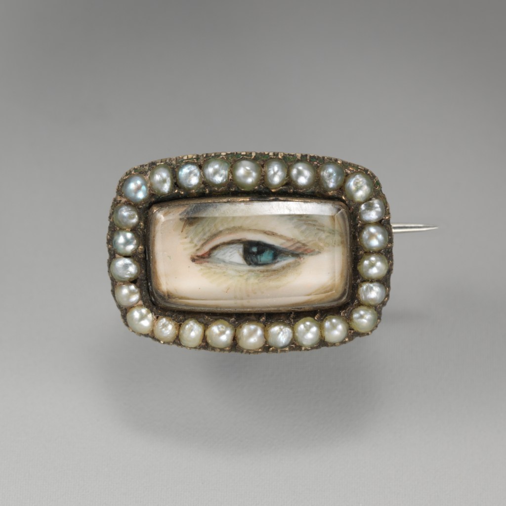 所谓“情人之眼”(Lover’s Eye)珠宝,于18世纪80年代至19世纪30年代之间在英格兰、欧洲大陆与美洲风靡一时。据推测,这一潮流由威尔士亲王(即后来的乔治四世)所引领——他将自己眼睛的微型肖像画赠予情人Mary Fitzherbert。此类微型图像通常被镶嵌于戒指、吊坠或胸针中,由所爱之人贴身佩戴。珍珠,常出现在这类珠宝的边框中,因象征纯洁与泪水,也可能使其兼具纪念性质,以悼念逝去的挚爱。