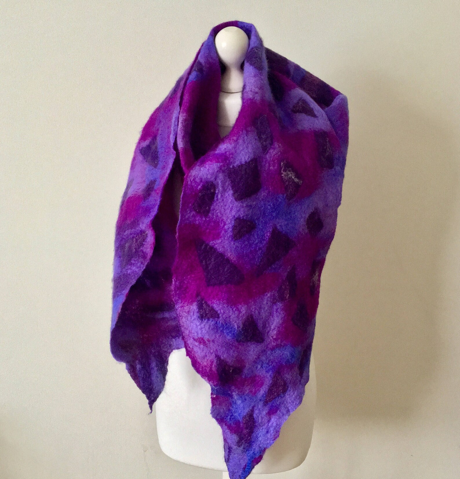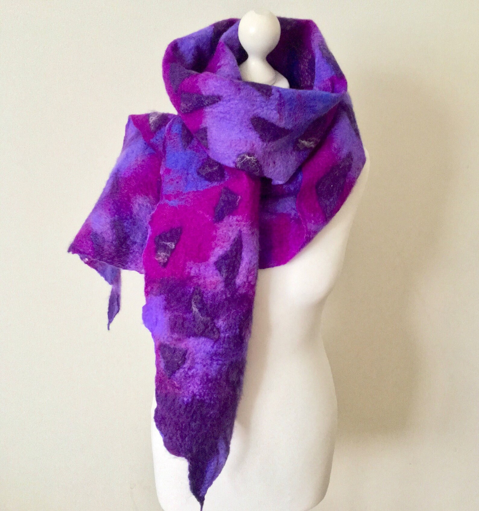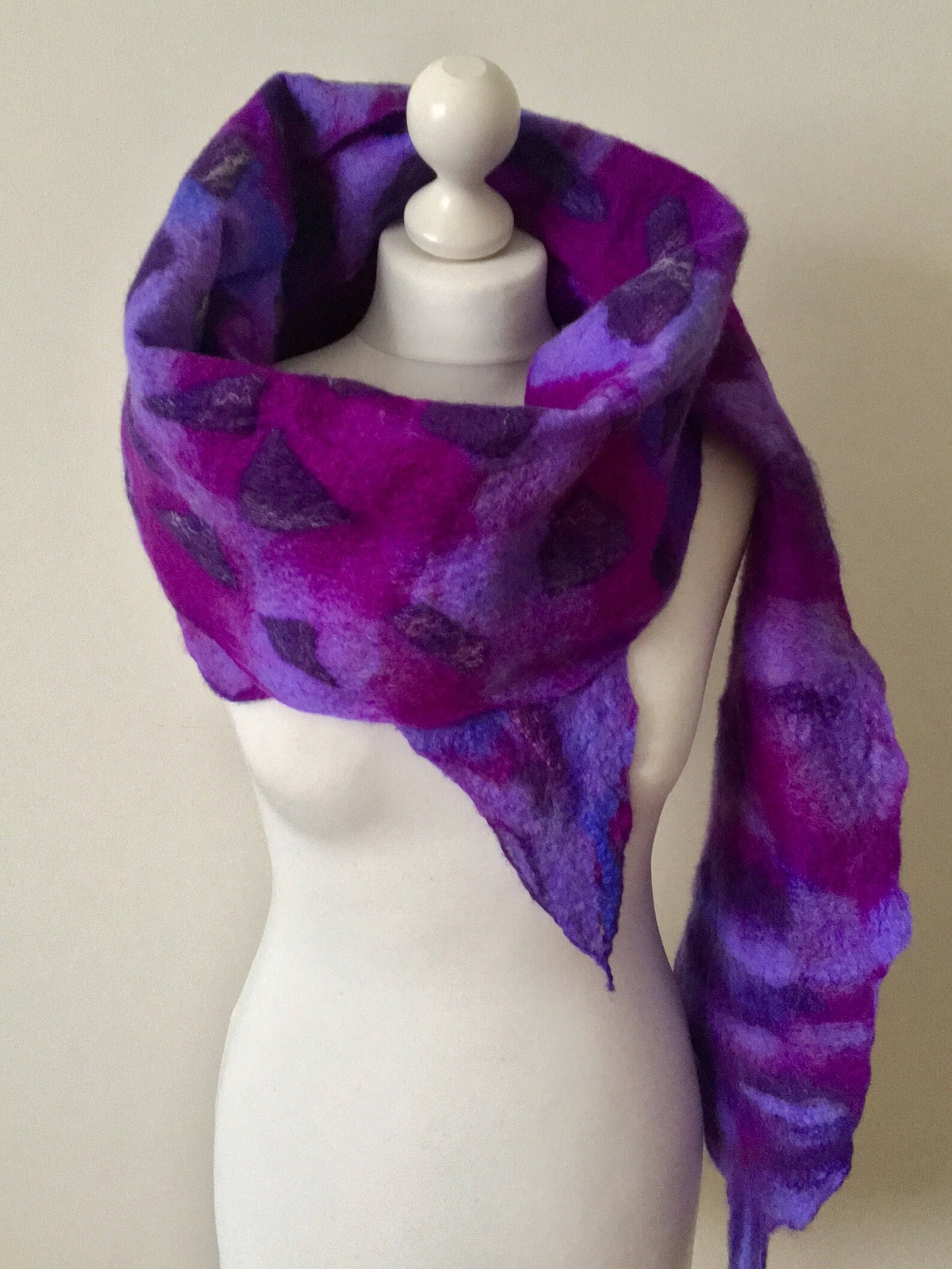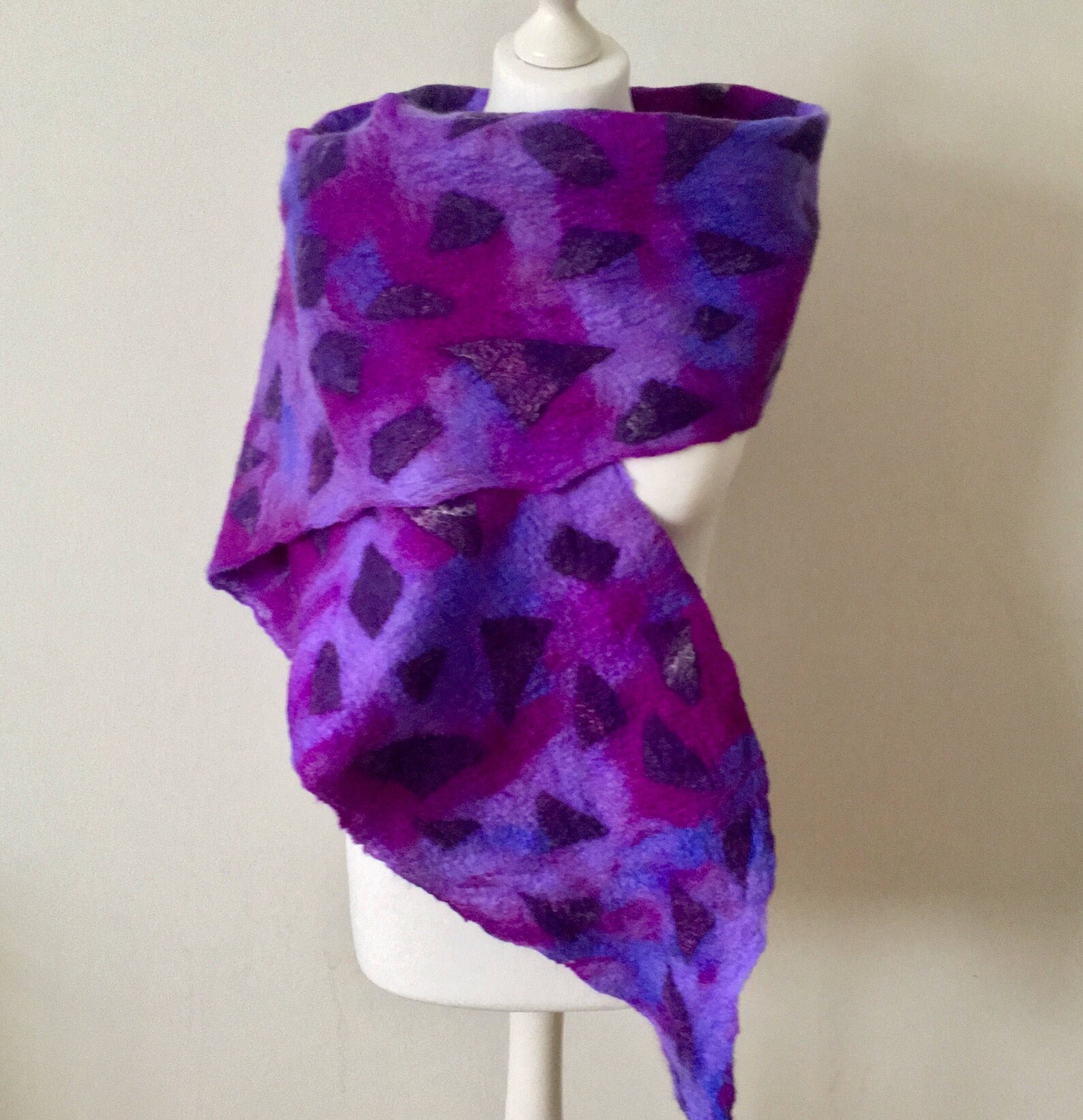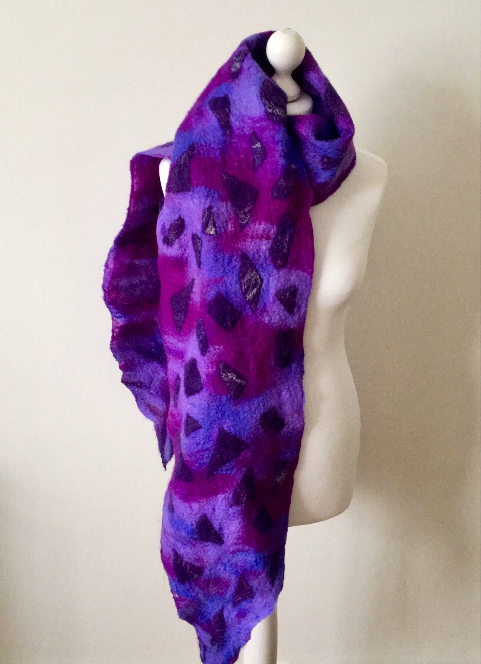 ②.紫蓝混色不规则碎片图案;「调色盘」艺术家·美利奴羊毛毡围巾披肩系列;咖啡色美拉德色;UK英国手艺人Jurate;Merino Wool WrapFelted Merino Wool使用湿毡技术,用柔软的美利奴羊毛精心手工毡制而成,温暖、柔软、明亮;长约230厘米/88英寸,宽约28厘米/11英寸;美利奴羊毛/丝绸/丝绸纤维;护养:如有需要请在温暖的肥皂水中手洗,轻轻挤压,平铺晾干