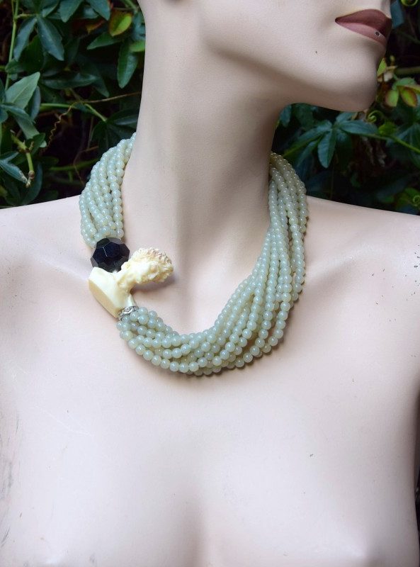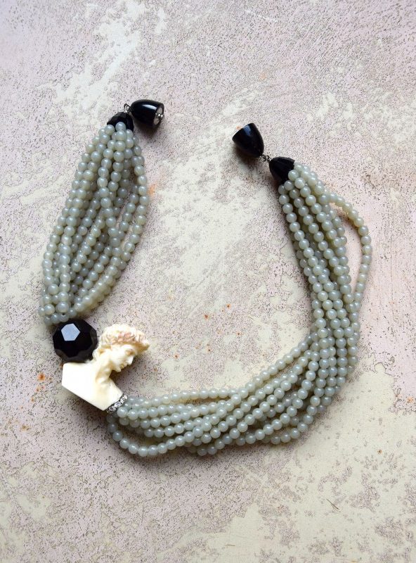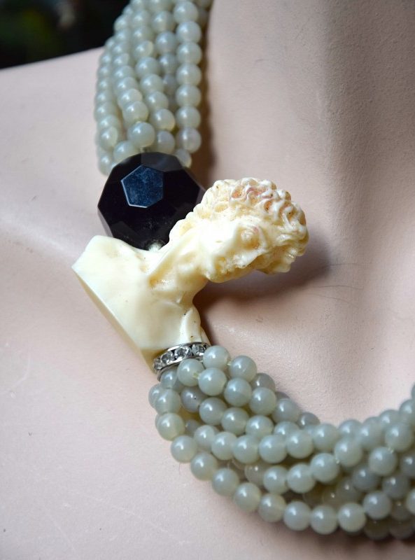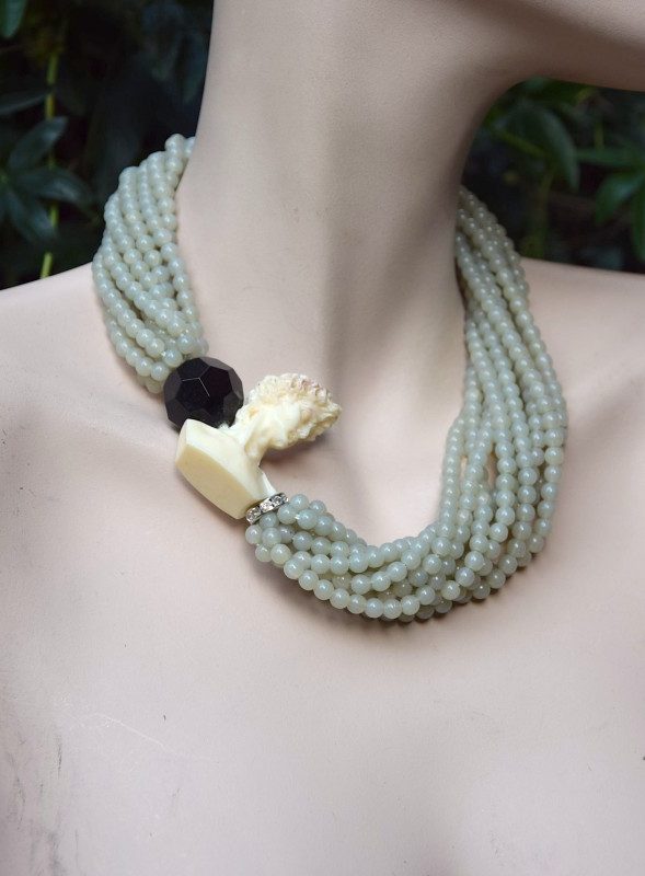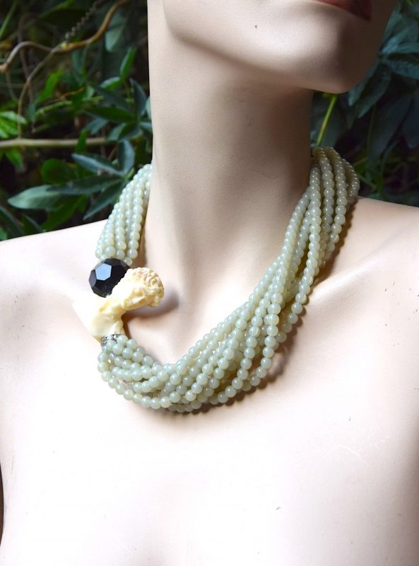 Fiocchi,意大利中古珠宝设计品牌,活跃于20世纪后期。其作品常以树脂、酚醛(Bakelite)等材质结合大胆的体量与装饰性造型,呈现出浓厚的意大利时尚珠宝风格。设计中常见绳索结构、雕塑感人物元素及强烈的色彩对比,整体风格兼具复古气息与戏剧张力。