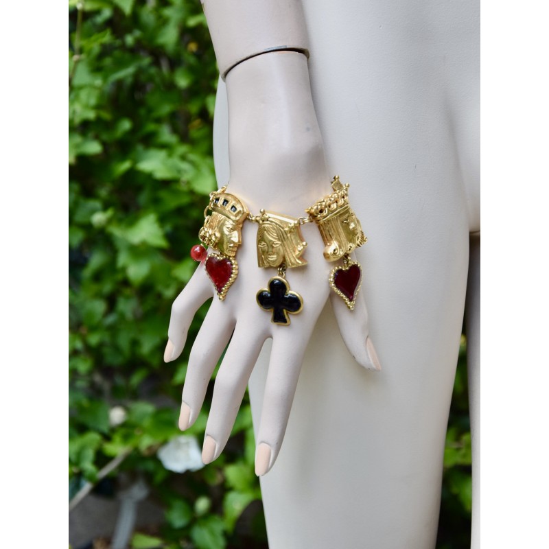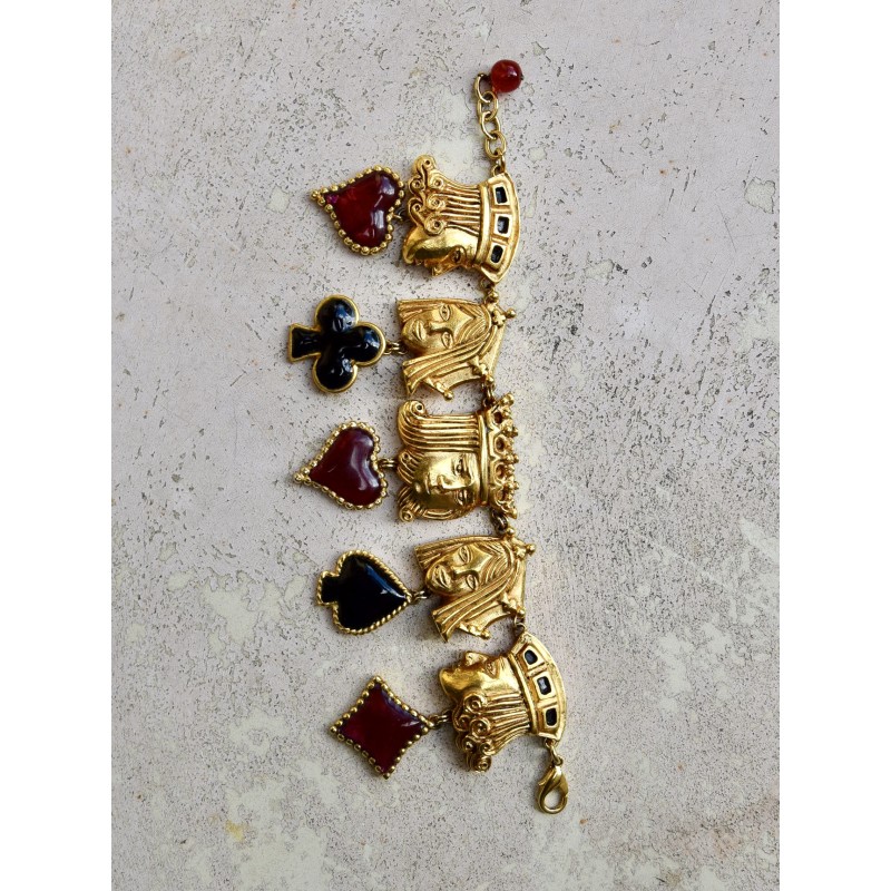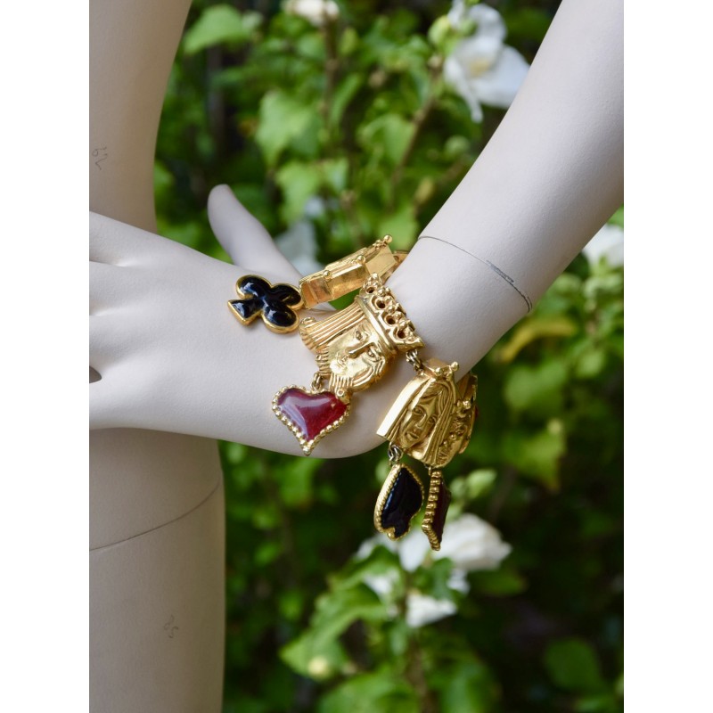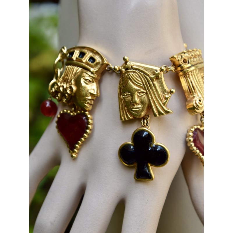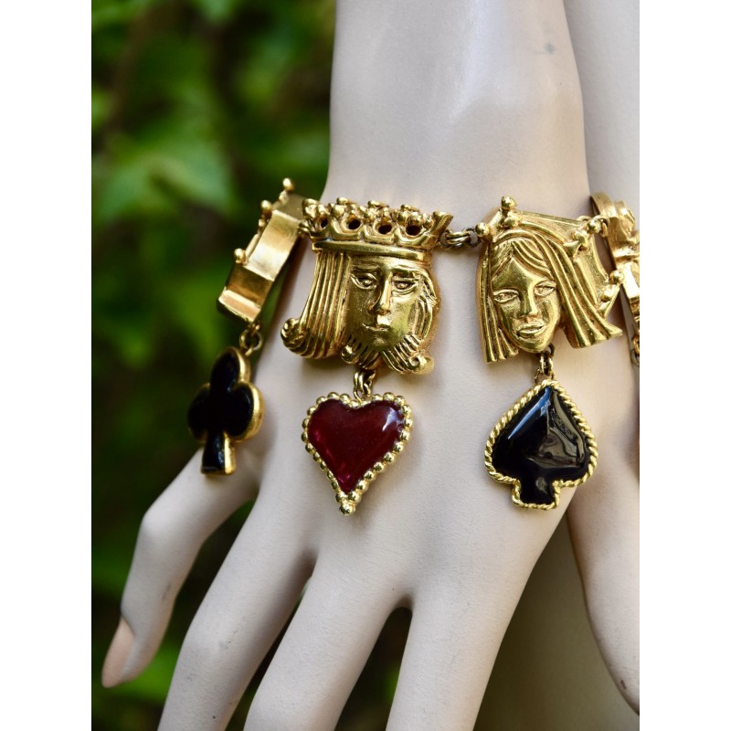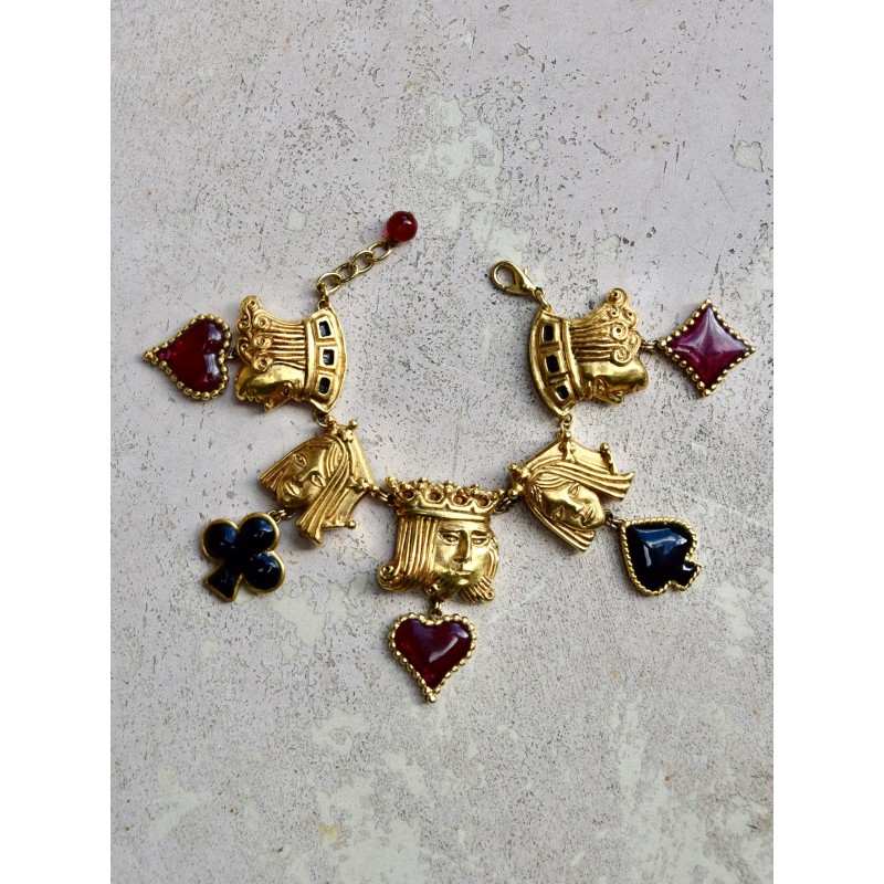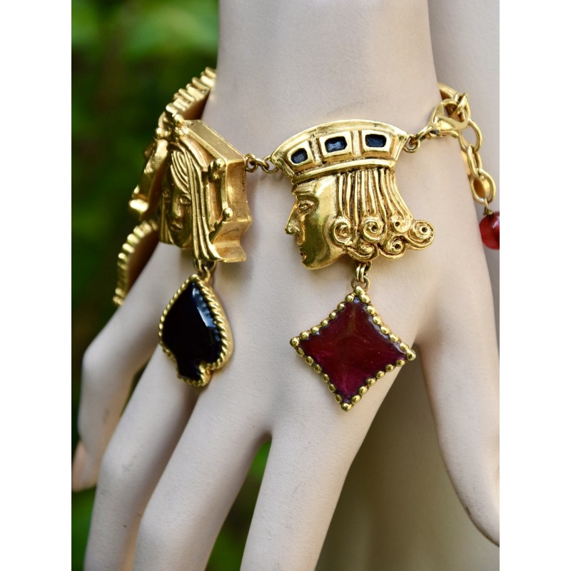 ②.国王王后侍从·头像扑克牌主题IC手链;华美且极为罕见的Isabel Canovas作品,出自“Les Jeux”系列(1991年冬季)。以扑克牌中的国王、王后与侍从头像为主题,每一枚皆配有对应的浇铸玻璃符号吊饰:红与黑两色,分别对应红心、方块与梅花、黑桃,隐含情感、财富、行动与命运的象征,构思巧妙而富有趣味。链条搭配龙虾扣闭合。背面刻有签名。镀金;法国制造IC7681