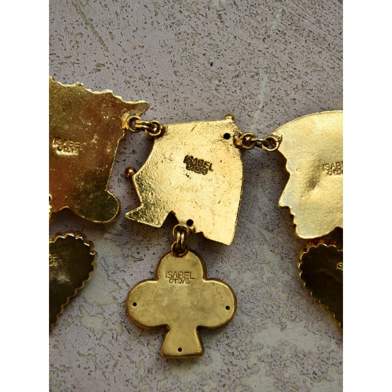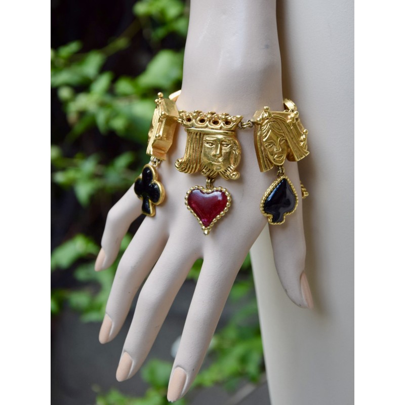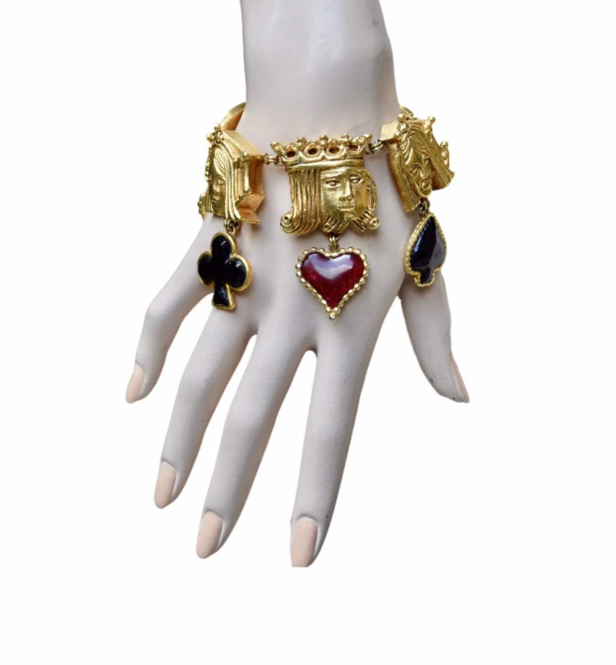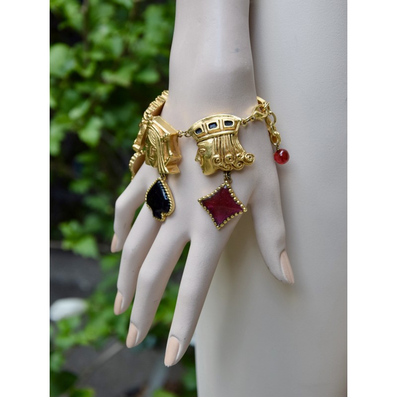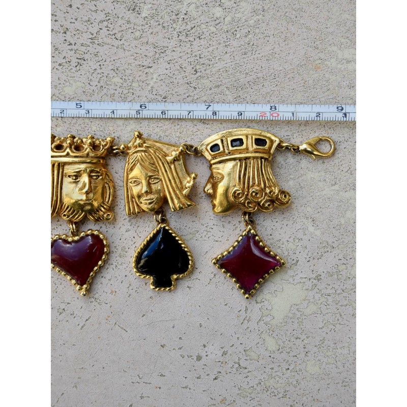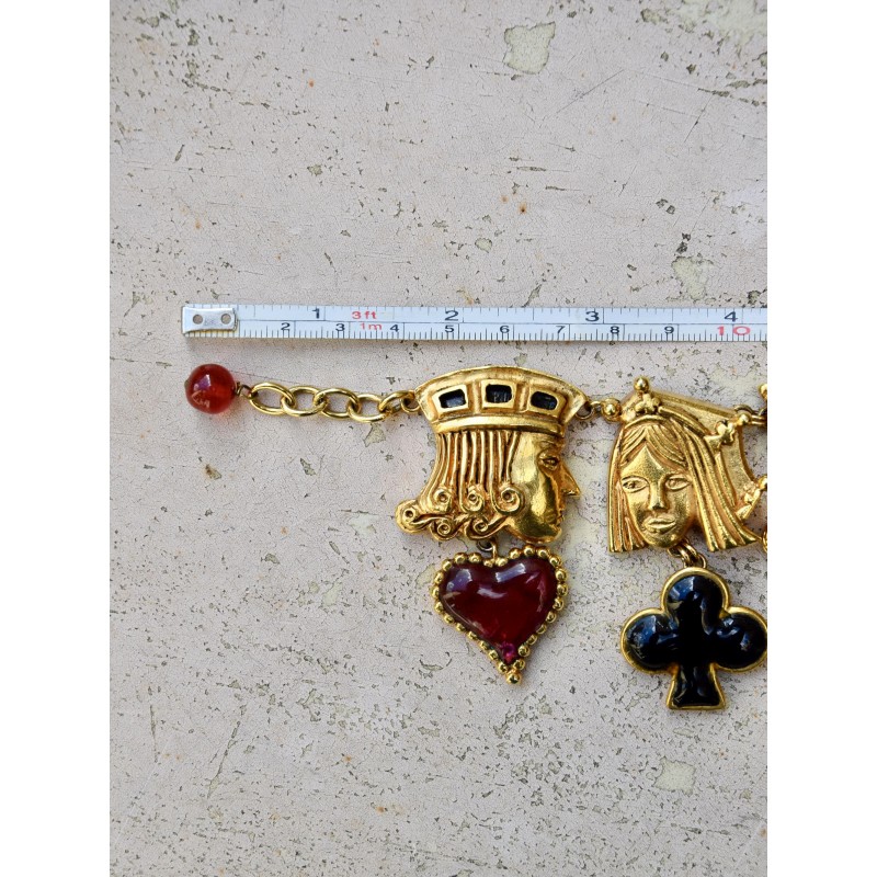 ②.国王王后侍从·头像扑克牌主题IC手链;华美且极为罕见的Isabel Canovas作品,出自“Les Jeux”系列(1991年冬季)。以扑克牌中的国王、王后与侍从头像为主题,每一枚皆配有对应的浇铸玻璃符号吊饰:红与黑两色,分别对应红心、方块与梅花、黑桃,隐含情感、财富、行动与命运的象征,构思巧妙而富有趣味。链条搭配龙虾扣闭合。背面刻有签名。镀金;法国制造IC7681
