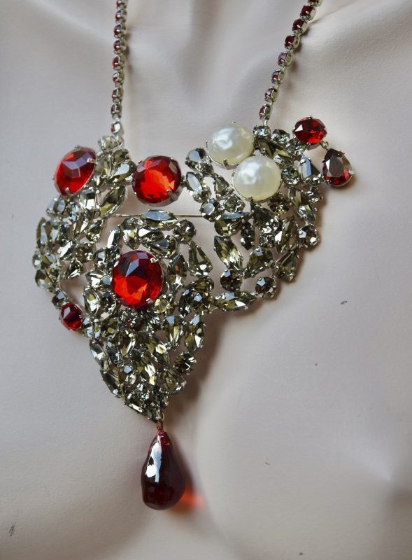 ②.传奇爱心设计·收藏级YSL胸针短项链;圣罗兰(Yves Saint Laurent)的标志性作品,诞生于20世纪60年代,最初仅制作了3件(分别收藏于品牌档案馆、大都会艺术博物馆以及私人收藏中)。该设计几乎出现在每一季高级定制秀中,并在多年间不断被重新演绎,配以红色水晶链条,亦推出更小尺寸版本。此件为大尺寸高级定制作品,镶嵌烟色水晶、红色玻璃弧面宝石(cabochon)与珍珠,底部垂有红色吊坠;配有一条可拆卸的红色水晶链,可作为短项链佩戴或作为胸针使用。背面带有品牌签名。合金/人造水晶珍珠等;法国制造90年代YSL10675
