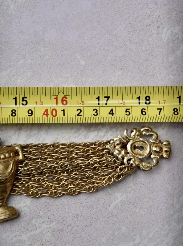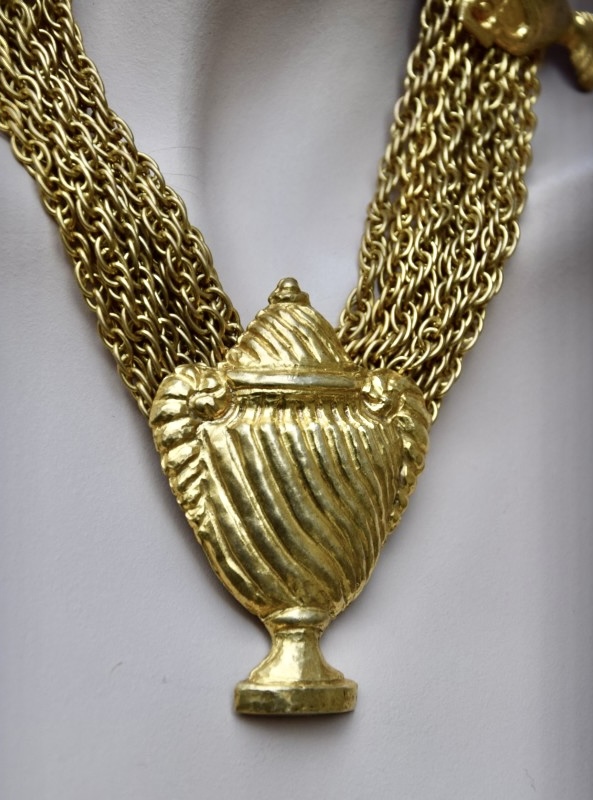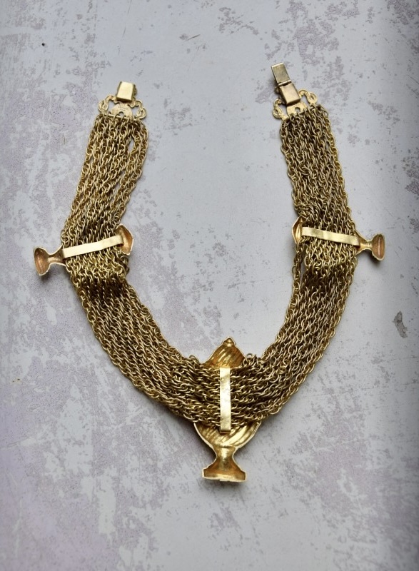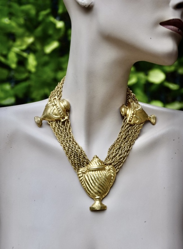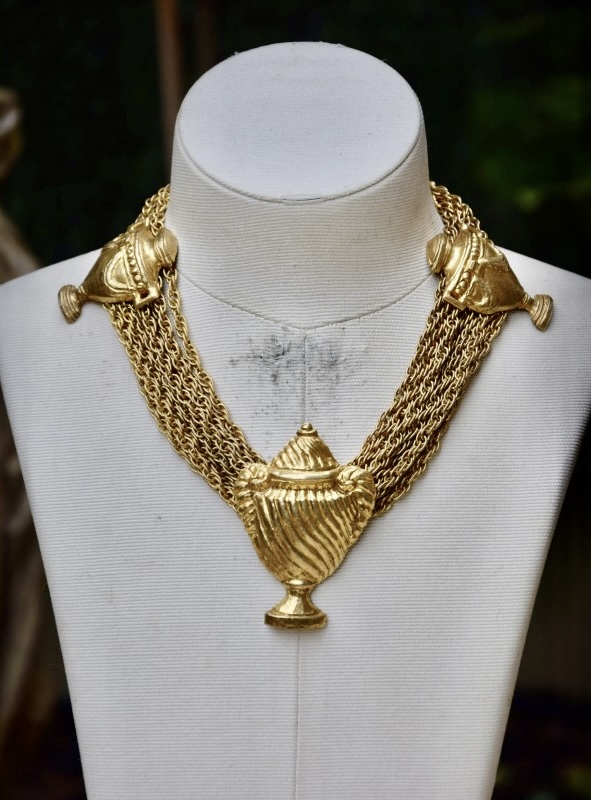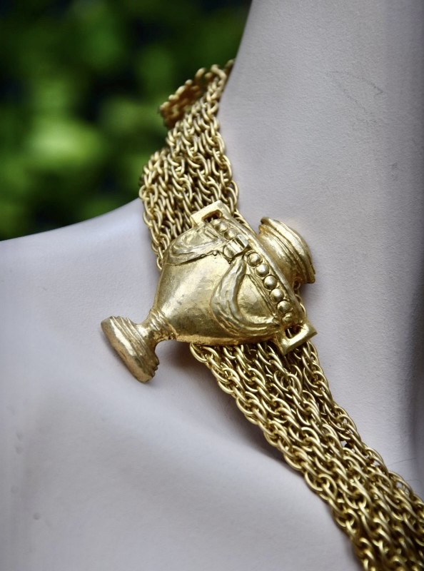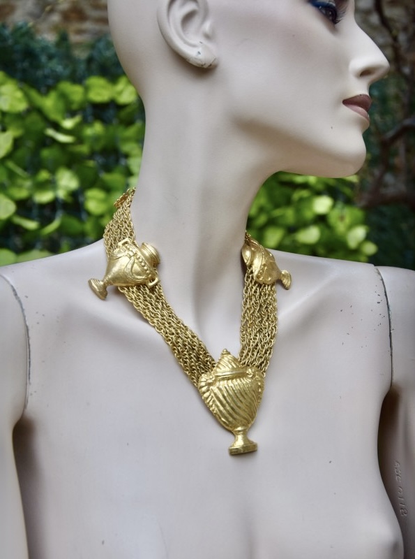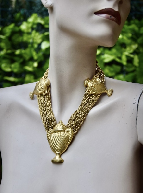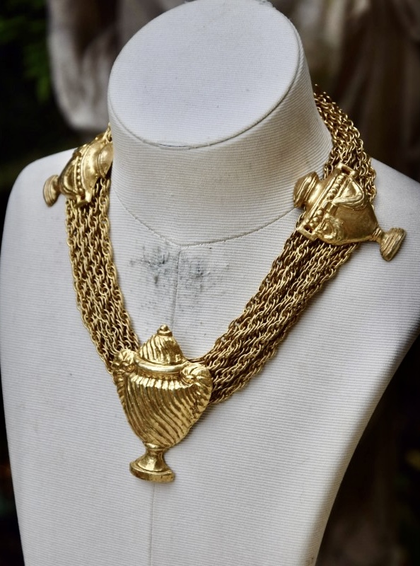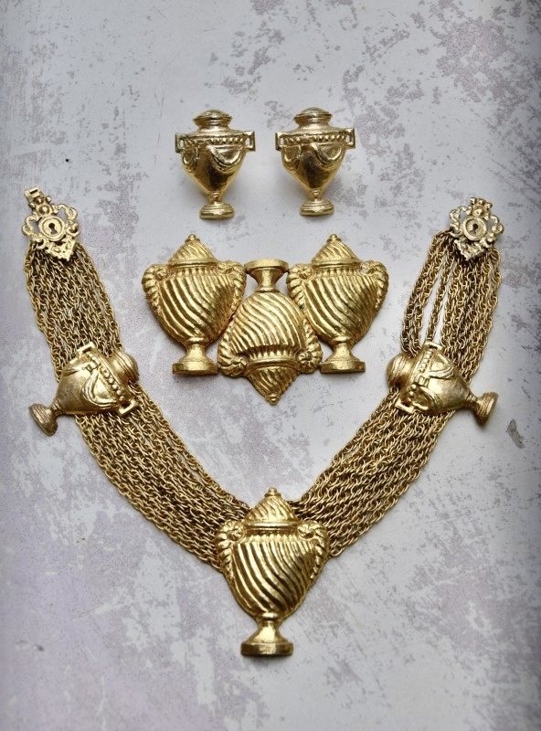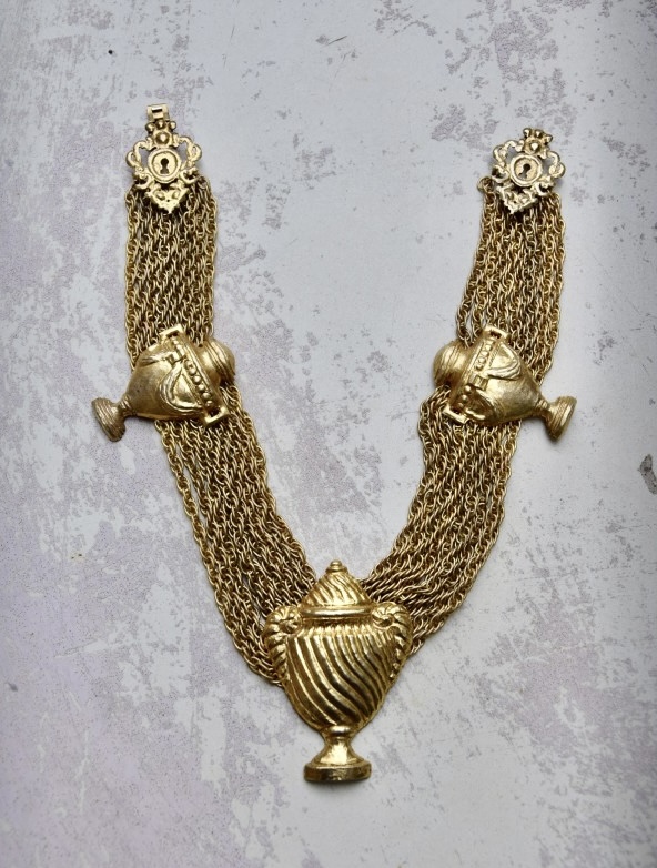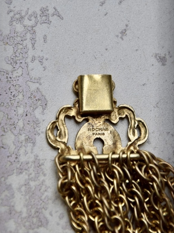 Rochas由Marcel Rochas于1925年在巴黎创立,以优雅和结构感的设计闻名,其首饰将古典灵感与现代造型结合,强调装饰性与雕塑感,借鉴古希腊、古罗马元素,通过金属和树脂等材质重新诠释,作品在比例上大胆且轻盈平衡,展现庄重与戏剧性的视觉效果,整体融合古典意象与法式优雅,形成独特的复古与现代张力,具有观赏性和收藏价值。
