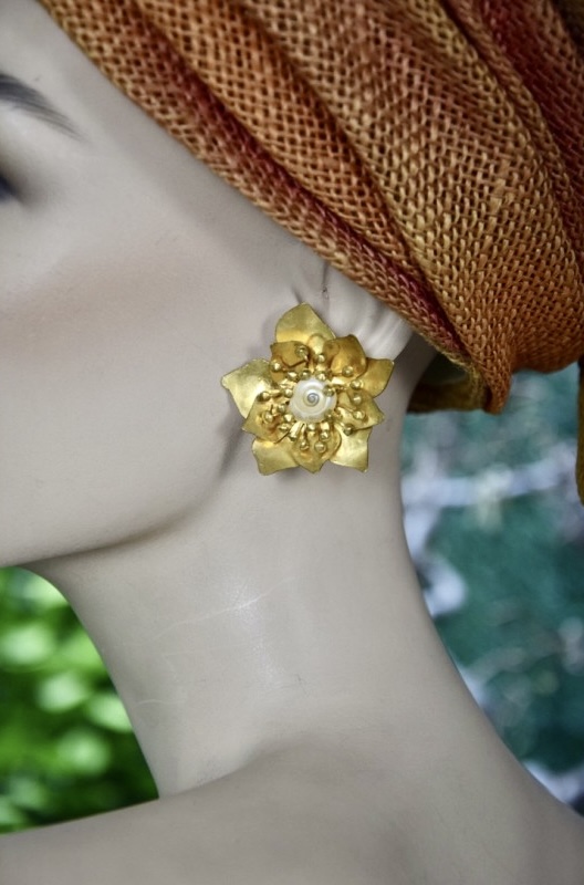 ②.桃花造型螺旋贝壳花芯HVDS耳环;现代主义与自然主义;一对精致迷人的金色黄铜耳环,呈桃花造型,花瓣与花蕾以浮雕镂刻呈现,花心饰有一枚小巧的珠光贝壳。背面带有品牌签名。镀金黄铜/贝壳;1980年代法国制造