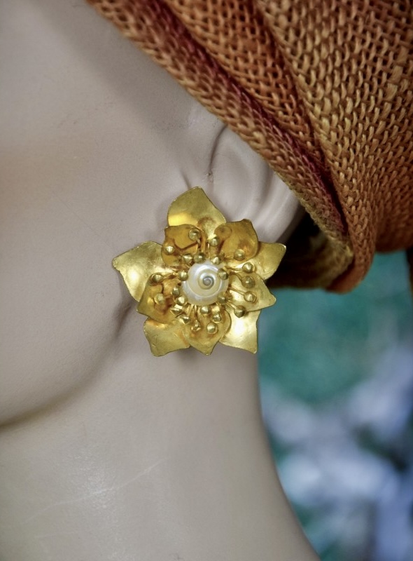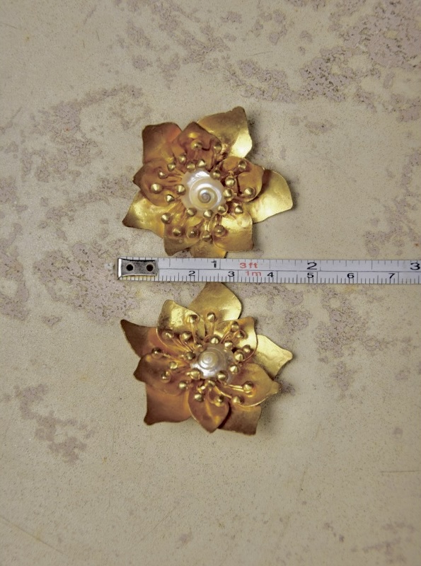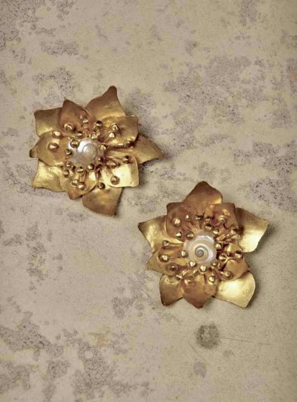 • ②.桃花造型螺旋贝壳花芯HVDS耳环;现代主义与自然主义;一对精致迷人的金色黄铜耳环,呈桃花造型,花瓣与花蕾以浮雕镂刻呈现,花心饰有一枚小巧的珠光贝壳。背面带有品牌签名。镀金黄铜/贝壳;1980年代法国制造