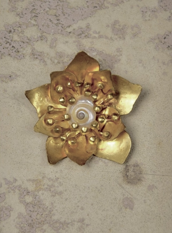 • ②.神秘仪式亦像在跳舞的”火焰”HVDS大胸针;一枚富含象征意味的锤纹金色黄铜胸针,上部分呈拇指交错相扣的两只竖立的手造型,下部分像舞动的双腿,带有原始部落般的仪式感与力量感。背面带有早期签名。镀金黄铜;1980年代法国制造