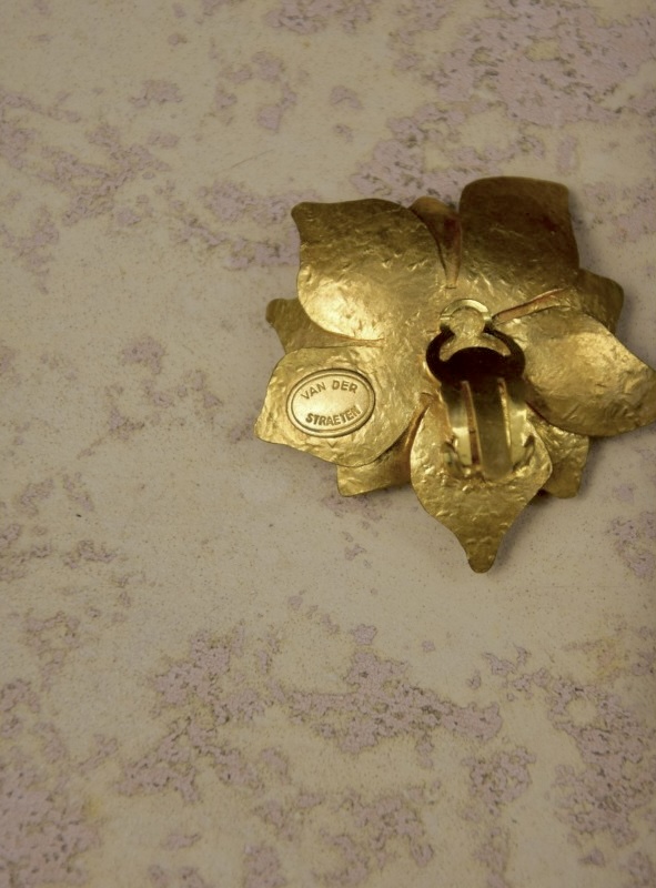 ②.神秘仪式亦像在跳舞的”火焰”HVDS大胸针;一枚富含象征意味的锤纹金色黄铜胸针,上部分呈拇指交错相扣的两只竖立的手造型,下部分像舞动的双腿,带有原始部落般的仪式感与力量感。背面带有早期签名。镀金黄铜;1980年代法国制造