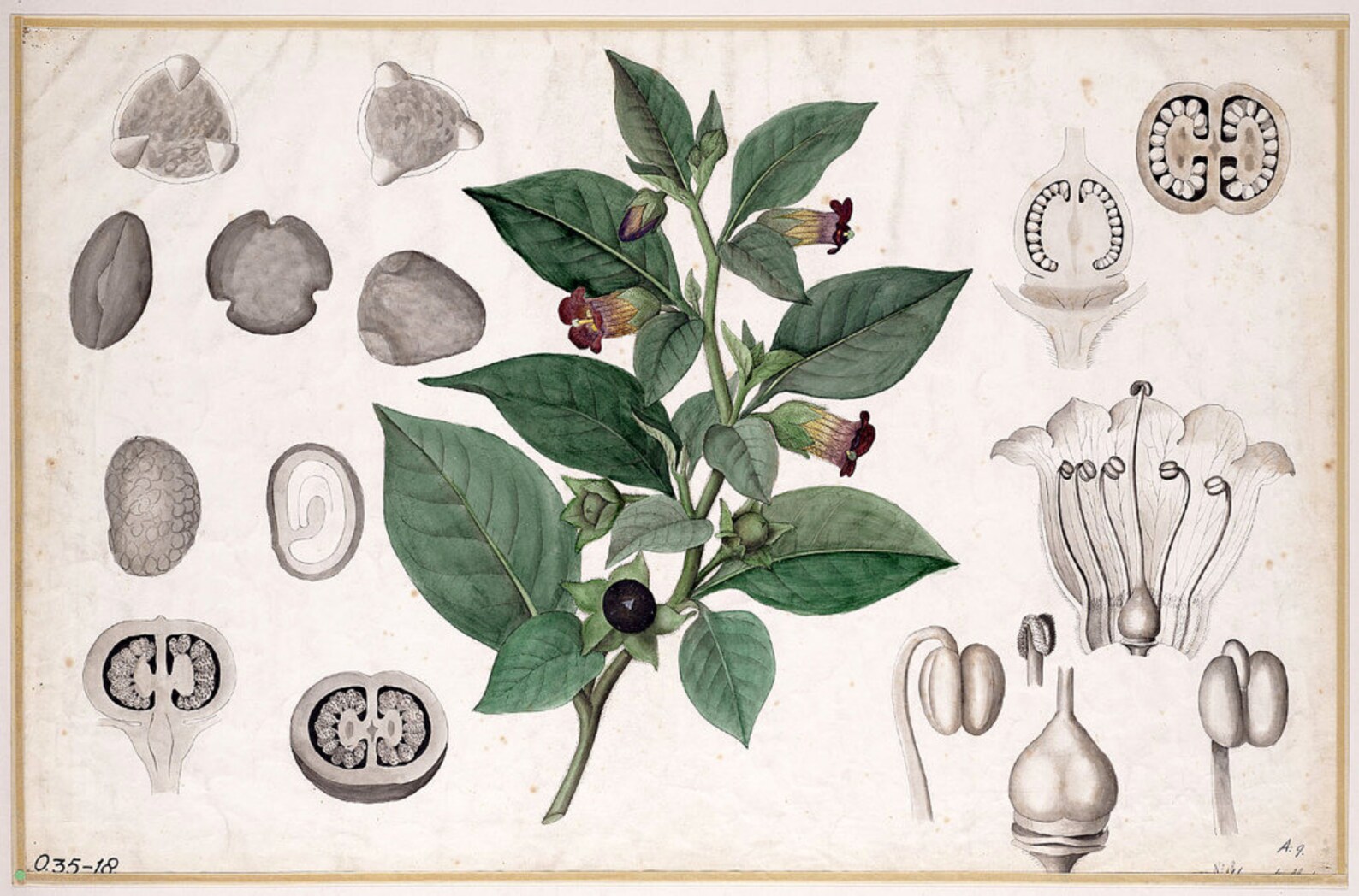 致命颠茄(Deadly Nightshade/Atropa Belladonna)为茄科植物,原产于欧洲、北非与西亚,历史上既被用作药物,也因其强烈毒性而广为人知。其学名“Atropa”源自希腊神话中掌控生命终结的命运女神,象征着对生命的裁断。在中世纪与神秘学传统中,颠茄常被视为魔法植物之一,被认为是“飞行软膏”的成分,与附子等植物共同出现。与此同时,它也进入日常生活——文艺复兴时期的女性曾以其制成美容剂,用于润红面颊与放大瞳孔,形成当时流行的审美。由于其含有强效生物碱,颠茄在历史上亦被用于毒药与战争。所有部位皆具毒性,使其成为欧洲最具代表性的危险植物之一。在文化与象征层面,颠茄始终游走于美丽与危险、诱惑与毁灭之间,成为一种极具张力的存在。