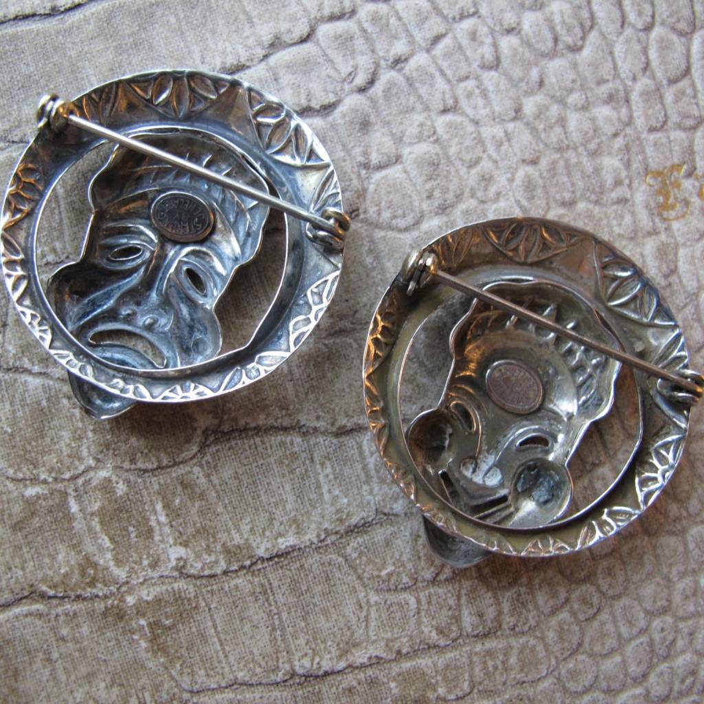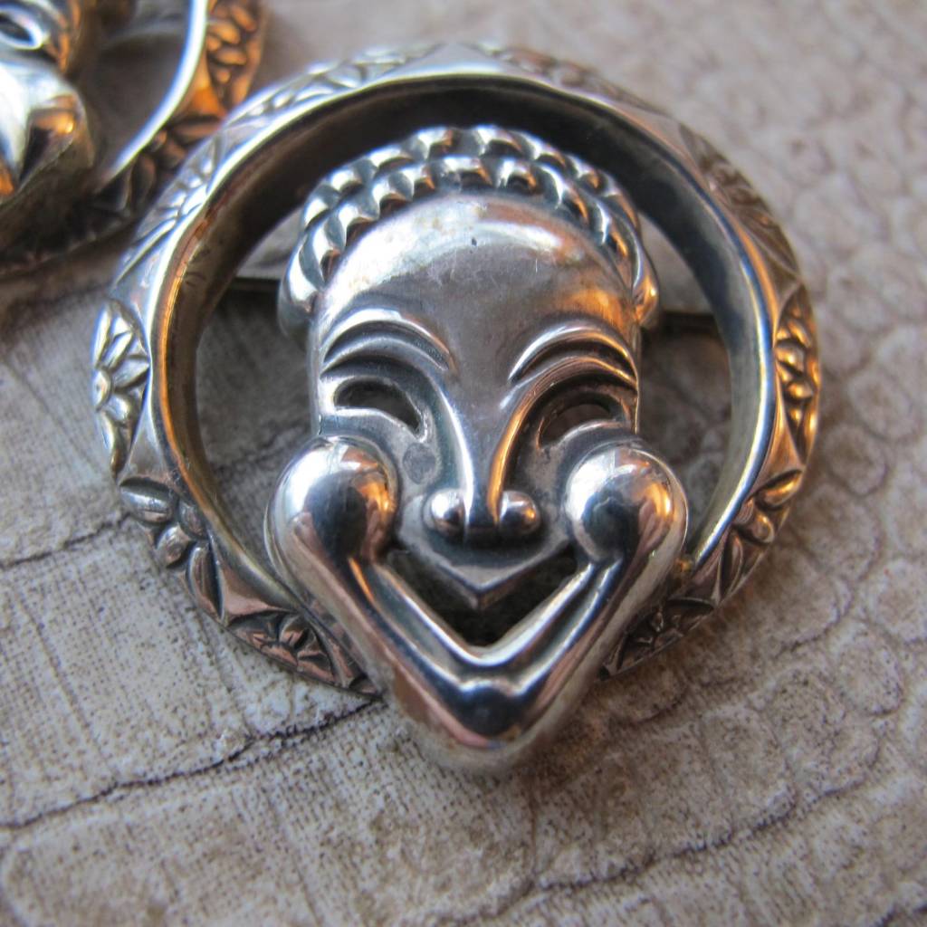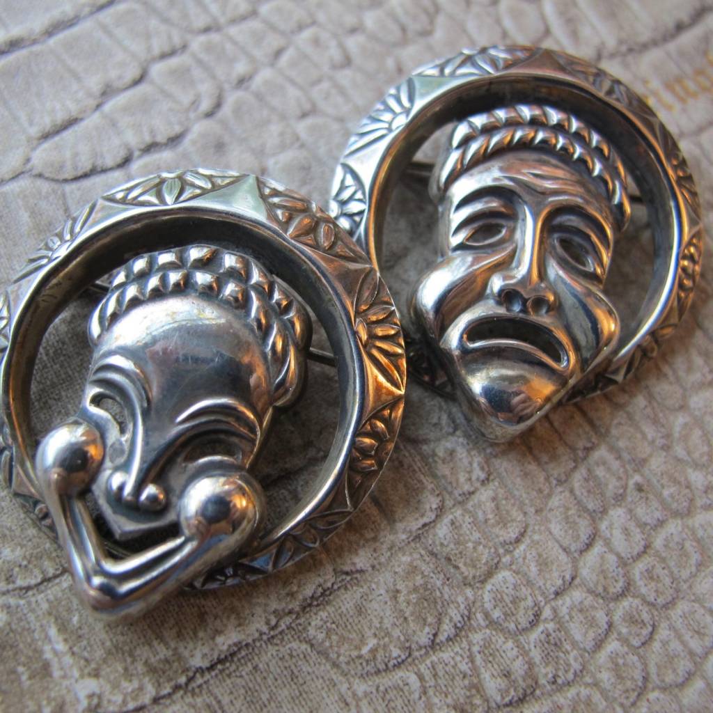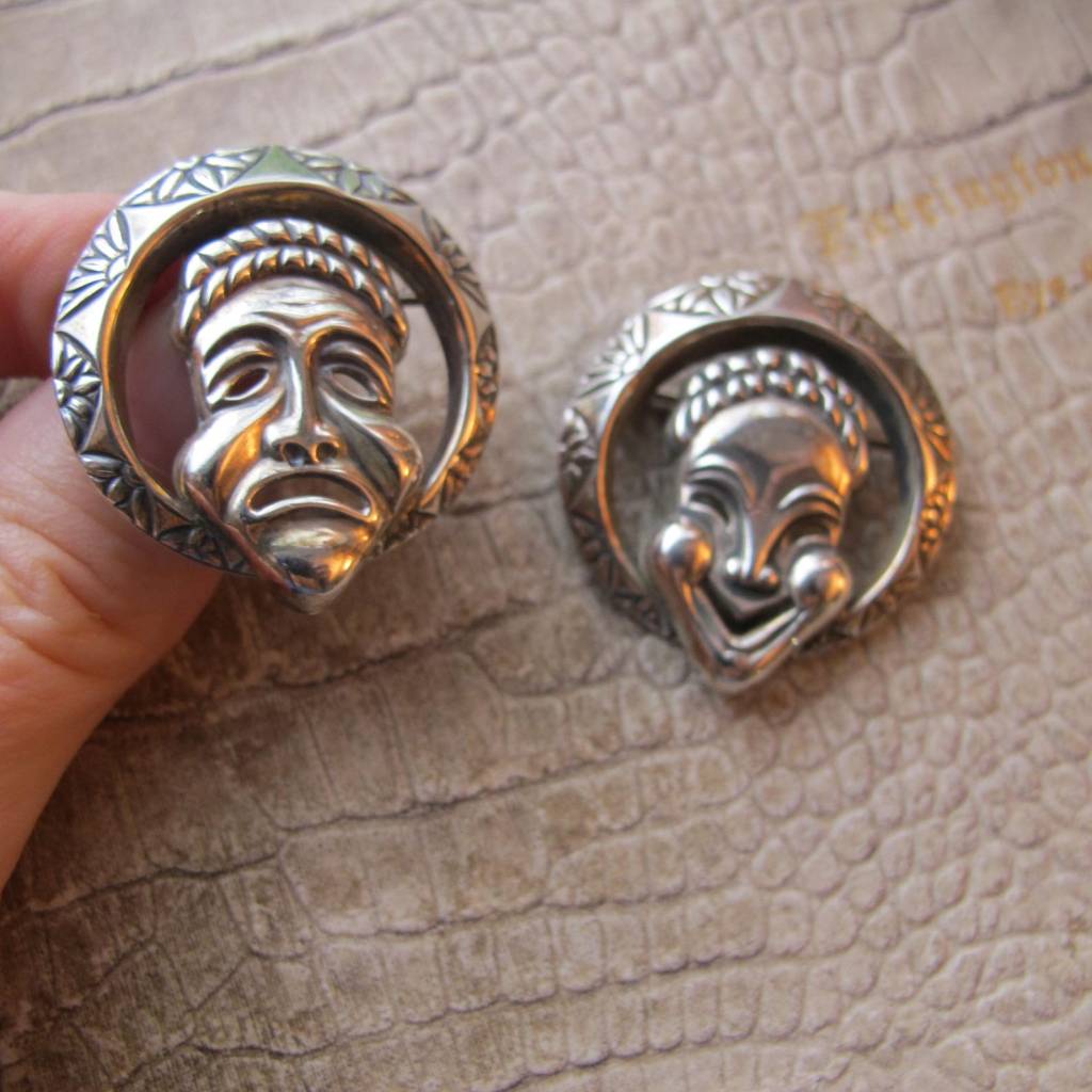②.古典喜剧与悲剧面具胸针套装;以古希腊戏剧表演中的经典面具为灵感,呈现喜剧与悲剧的情绪表情。造型精巧,可搭配衬衫/西装翻领或作为造型点缀,保留了年代感的趣味与收藏价值。925纯银;1940–50年代;约3.3–3.6cm;背面带品牌签名;藏于美国