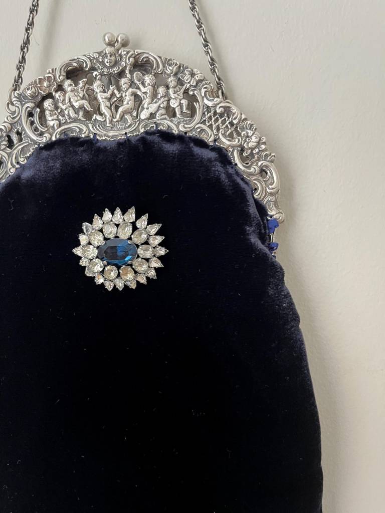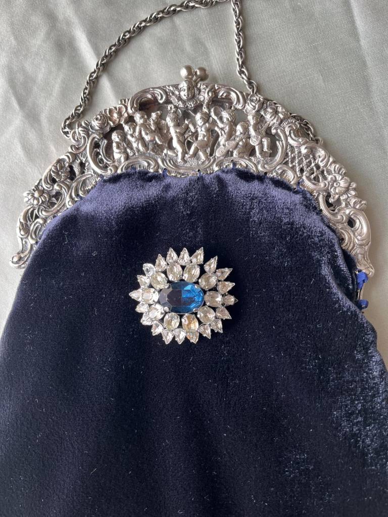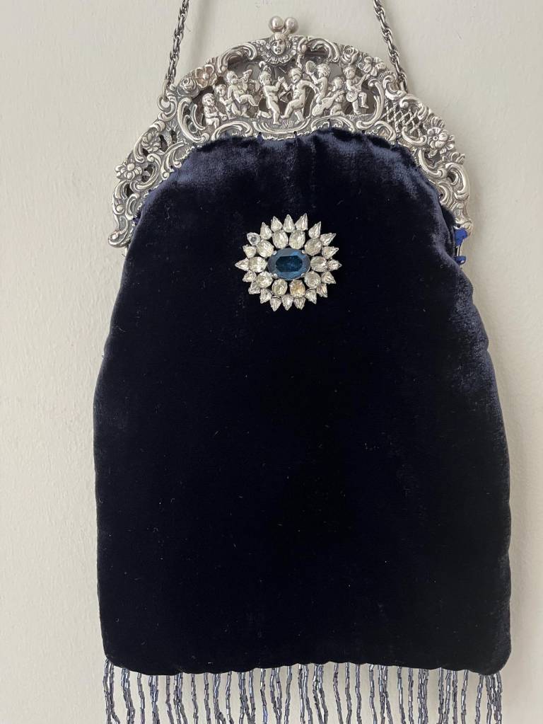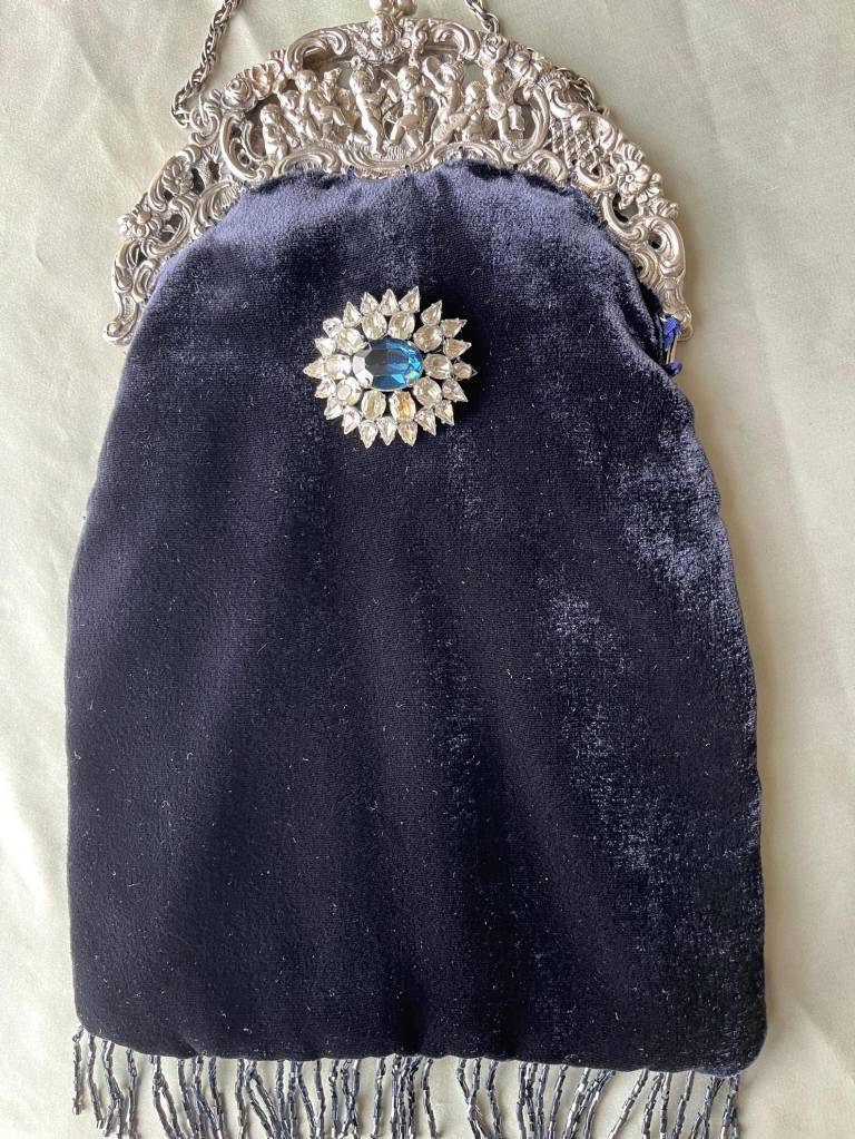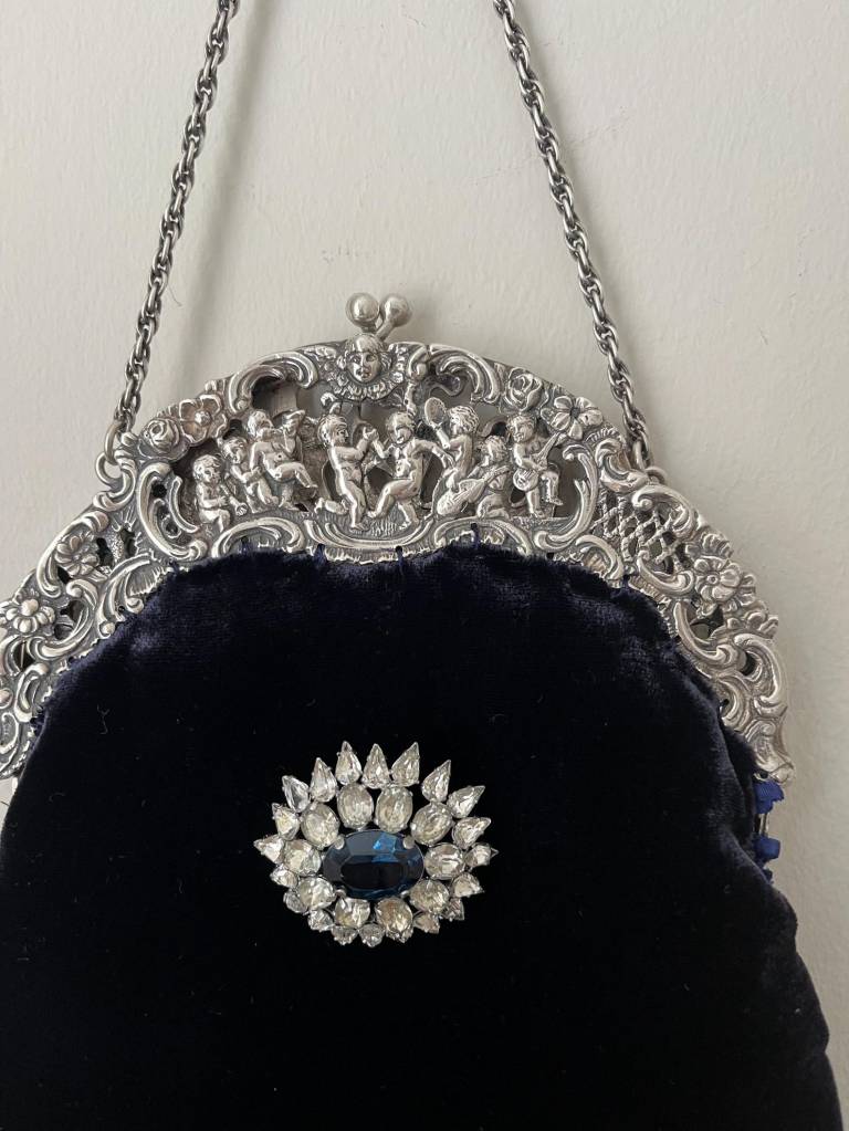 ②.1920年代银色框改造丝绒手袋(Peruzzi);爱尔兰手艺人Cathy;古董银色手袋框,内侧刻有Peruzzi Boston Silver标记(无925银标,多为镀银或银色合金),饰以浮雕小天使(cherubs / putti)与繁复纹样。原始链条仍在。袋身以深蓝色丝绒制成,下缘配有黑色珠饰流苏;正面别有一枚可拆卸的捷克玻璃胸针。内衬为Duchesse丝绸,并以丝带与钩针花装饰。整体由古董框架与多种复古元素重构而成。银色金属/织物/玻璃等;尺寸约18×30cm(含流苏);古董材质改造·孤独品