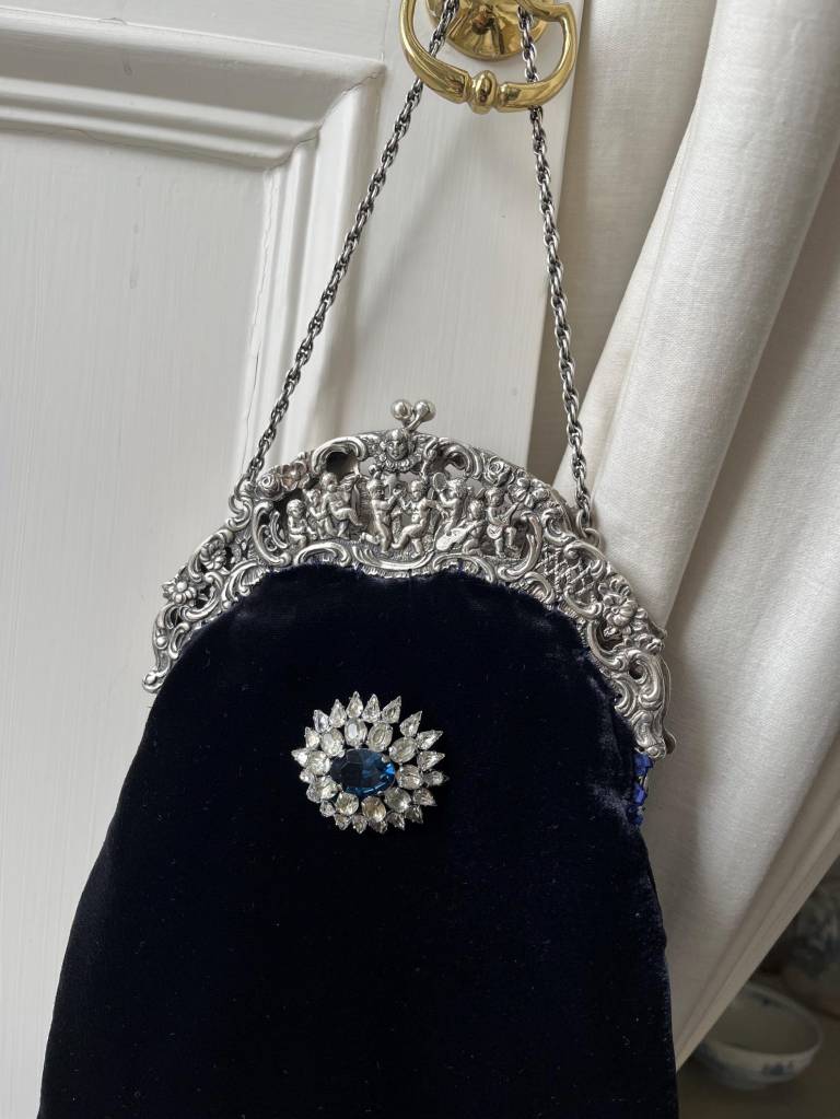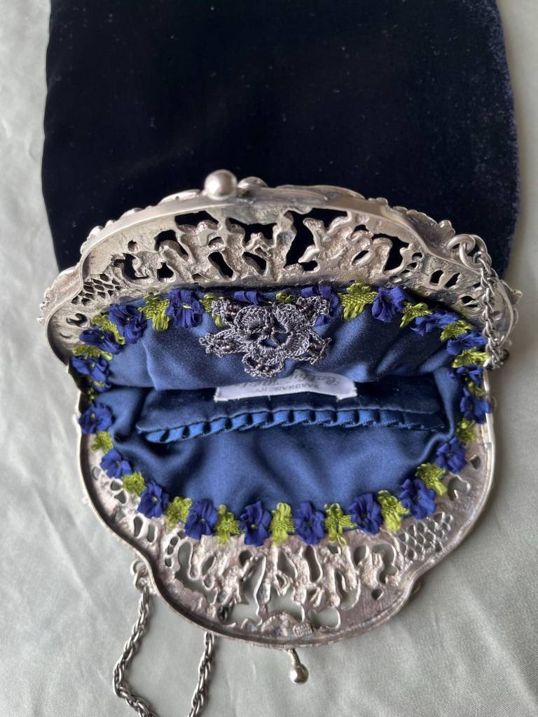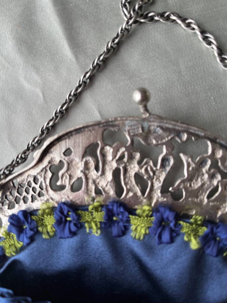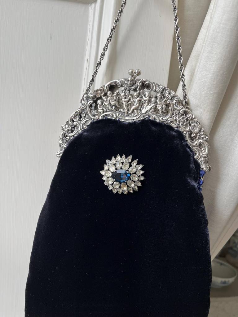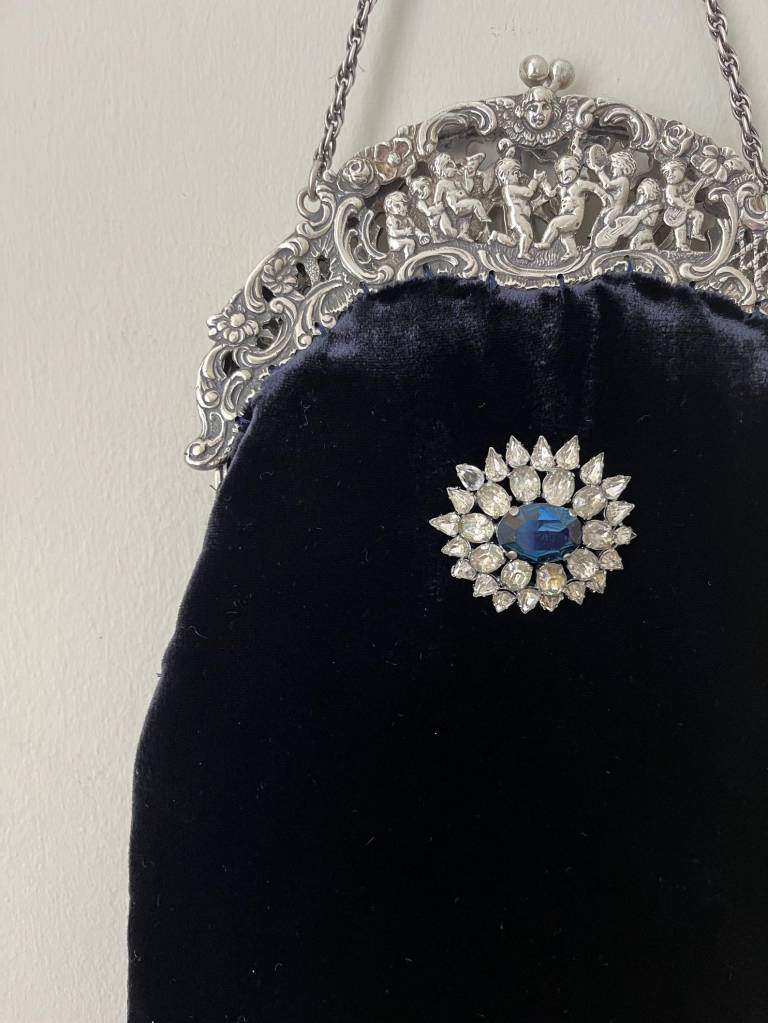 ②.1920年代银色框改造丝绒手袋(Peruzzi);爱尔兰手艺人Cathy;古董银色手袋框,内侧刻有Peruzzi Boston Silver标记(无925银标,多为镀银或银色合金),饰以浮雕小天使(cherubs / putti)与繁复纹样。原始链条仍在。袋身以深蓝色丝绒制成,下缘配有黑色珠饰流苏;正面别有一枚可拆卸的捷克玻璃胸针。内衬为Duchesse丝绸,并以丝带与钩针花装饰。整体由古董框架与多种复古元素重构而成。银色金属/织物/玻璃等;尺寸约18×30cm(含流苏);古董材质改造·孤独品