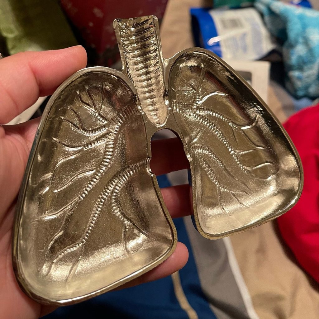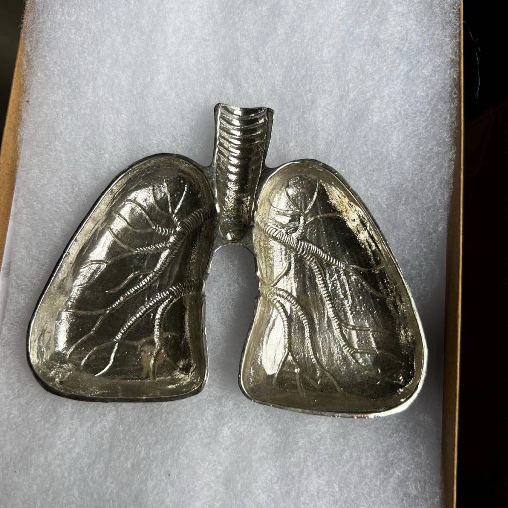 • ②.「痕迹的累积…」解剖学式肺形器皿 / 烟灰缸;美国手艺人Anatomology作品;以肺部为形,结构直接而清晰,呈工业感金属色泽。将器官转化为可见的日常之物,可作为烟灰缸使用,亦可用于收纳或陈列。当它被作为烟灰缸使用时,表面的变化会逐渐累积,使原本的形态发生转变,引发思考「关于行为本身,以及它所留下的痕迹」。锌合金铸造;约5英寸(12.7cm)|x8226