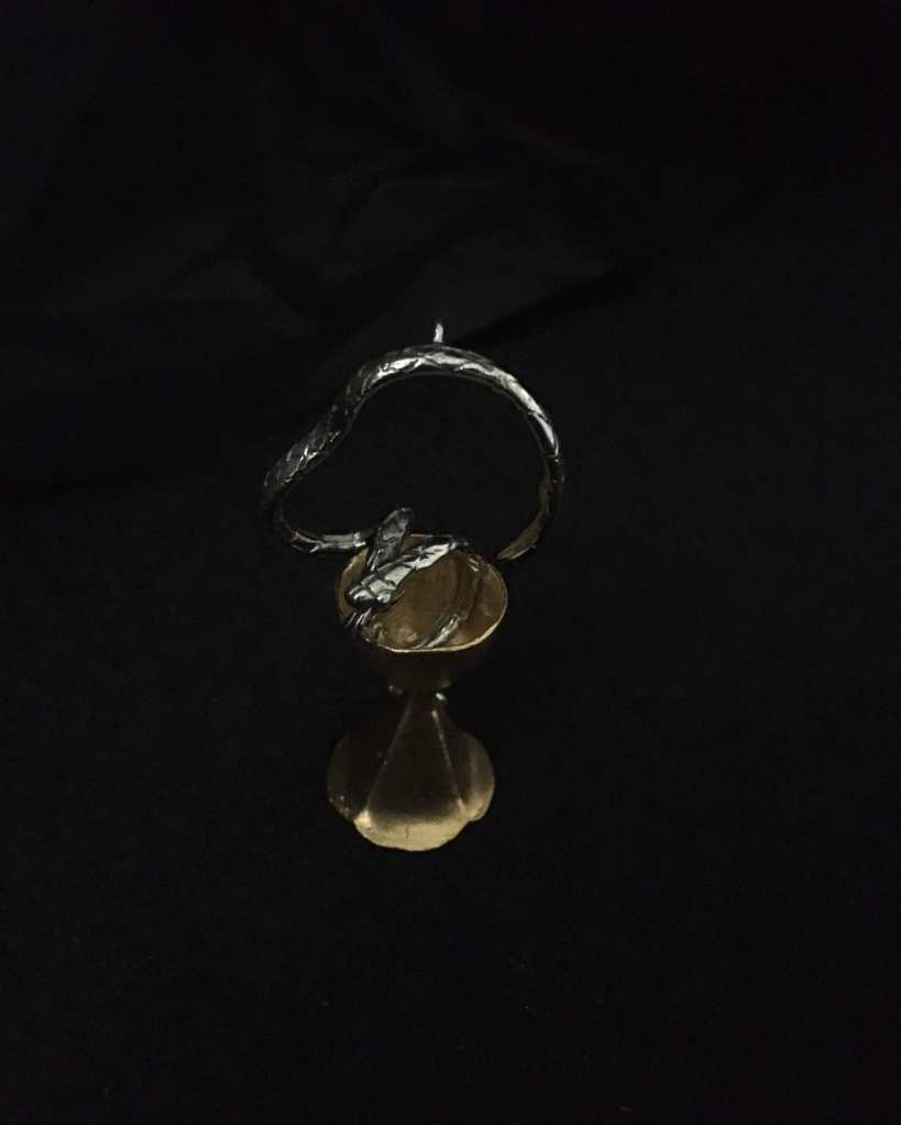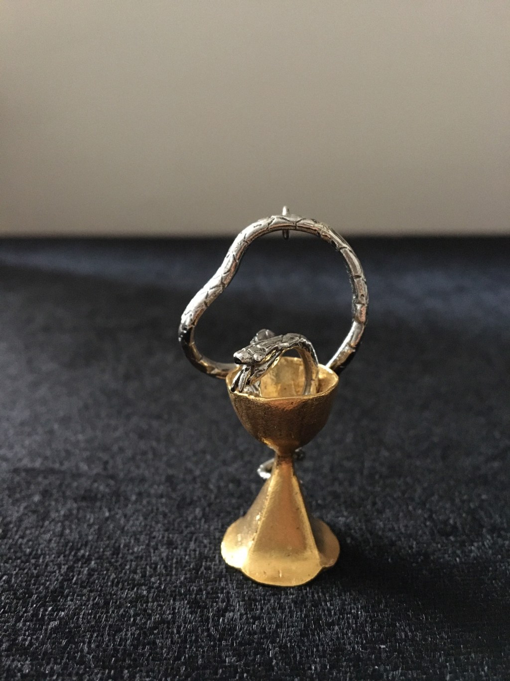 “蛇与杯”的组合在西方视觉传统中有着清晰的来源:最常见的形象是“许癸厄亚之碗”(Bowl of Hygieia)——一条蛇缠绕于杯,作为药学的象征,至今仍被广泛使用。许癸厄亚是古希腊的健康与卫生女神。