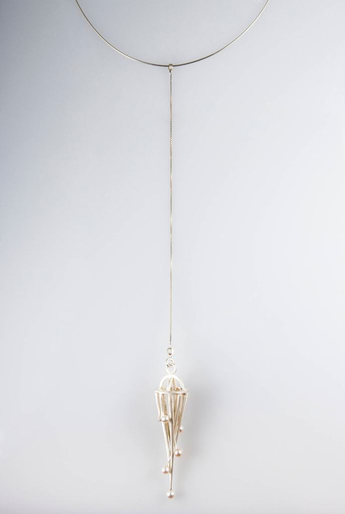 • ②.「本体的喜悦」囚笼(珍珠)·美神系列·项坠项链项圈;美国手艺人Zbigniew作品|有时,美之所以让人疲惫,是因为我们试图依附它、维持它、成为它。对身体的照顾——睡眠、饮食、运动,以及阅读,是为了保有一种对生活的掌控感,让自己变得稳定而清晰;而美是随之浮现的副产品。在你意识到,你可以只是经历和享受各种形相,而不被它定义,你已在它的囚笼之外。|925纯银/淡水珍珠;吊坠约2.54×8.89cm,项链长度约20.32cm;每件珍珠/宝石的颜色与形状,以及银的表面处理,雕塑尺寸略有不同;亦可定制尺寸|x10326