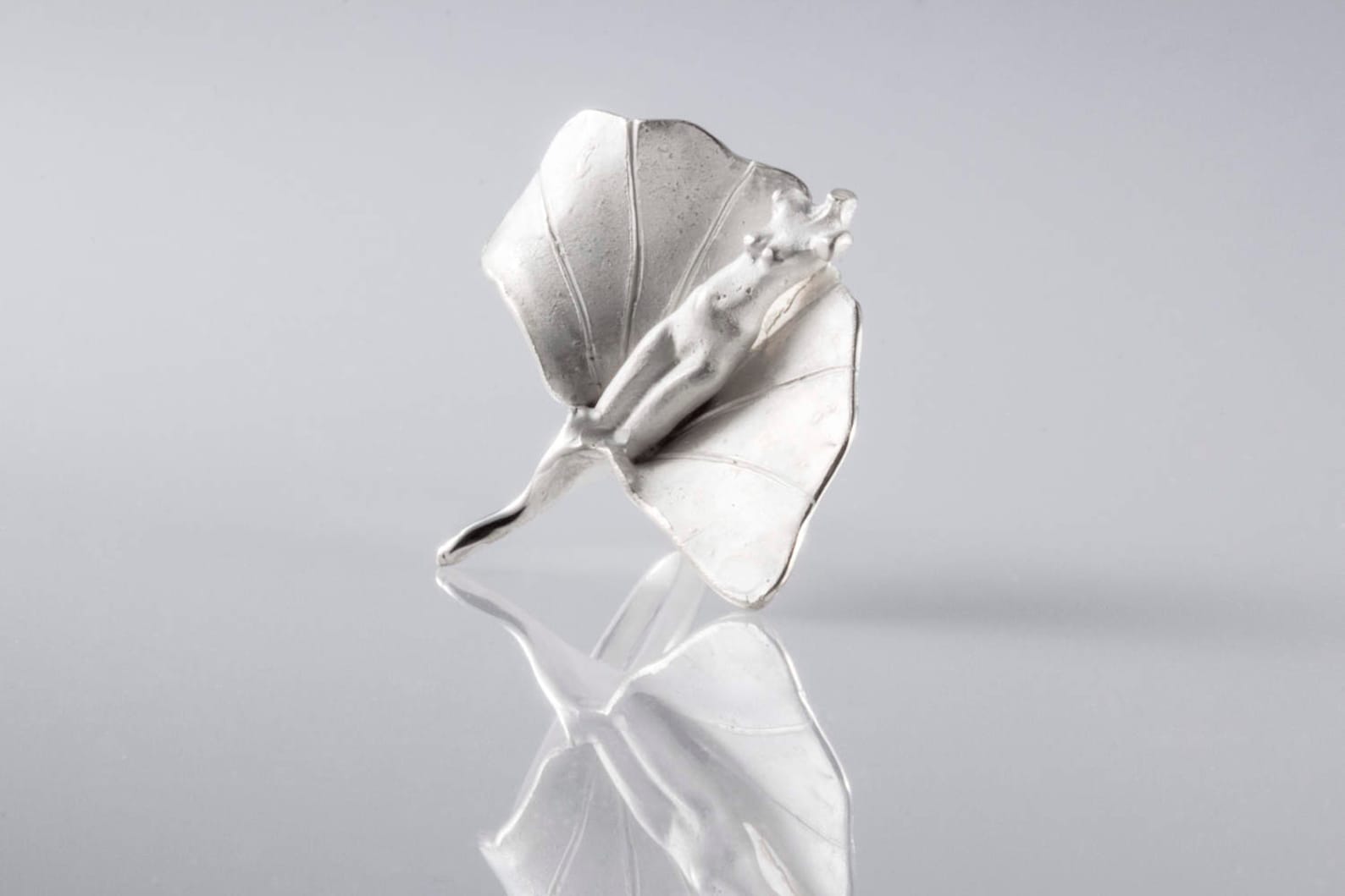 • ②.「本体的喜悦」维纳斯(银杏叶)·美神系列·戒指环;美国手艺人Zbigniew作品|有时,美之所以让人疲惫,是因为我们试图依附它、维持它、成为它。对身体的照顾——睡眠、饮食、运动,以及阅读,是为了保有一种对生活的掌控感,让自己变得稳定而清晰;而美是随之浮现的副产品。在你意识到,你可以只是经历和享受各种形相,而不被它定义,你已在它的囚笼之外。|925纯银;雕塑约2.54cm;定制尺码;每件银的表面处理,雕塑尺寸略有不同;亦可定制尺寸|x10426